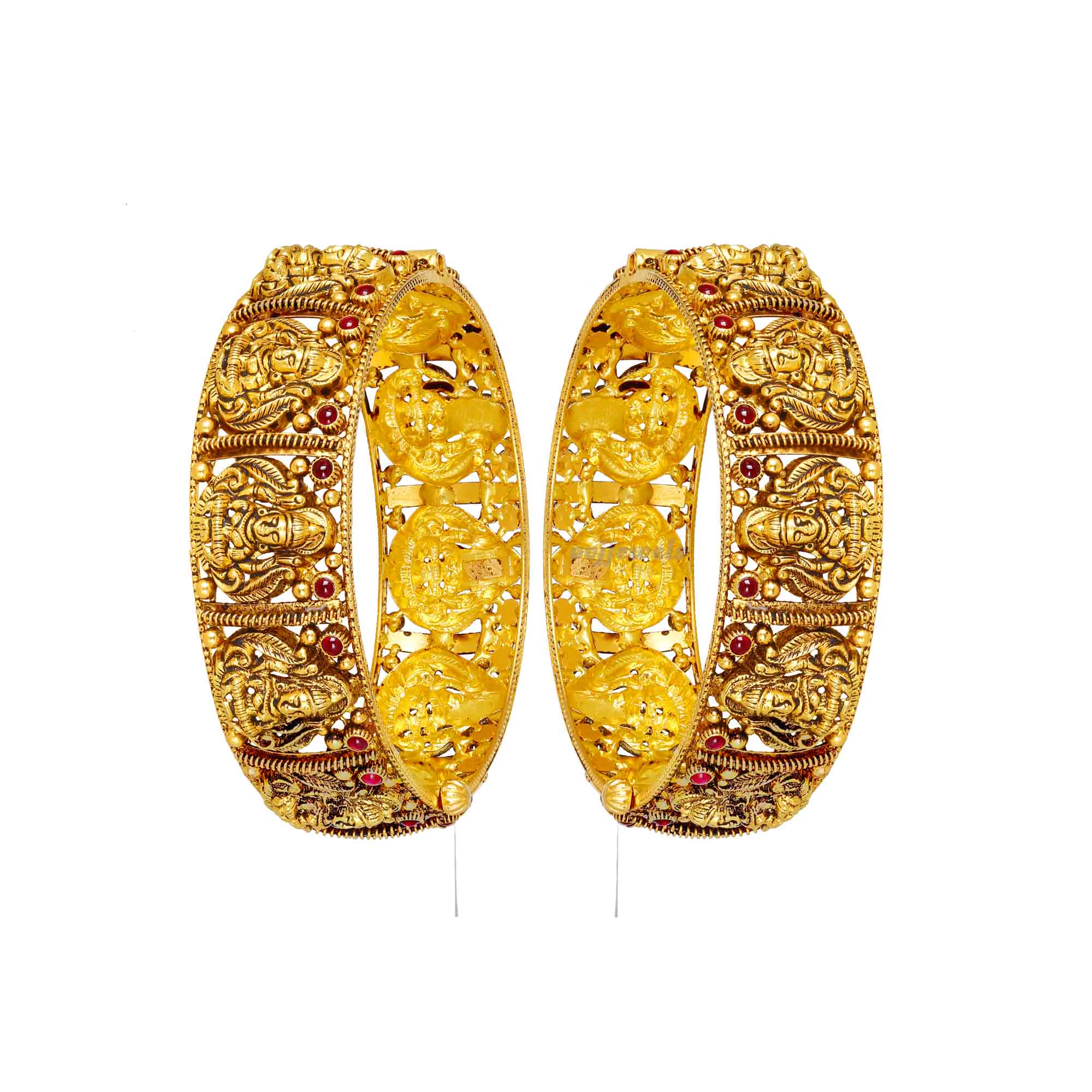 Kemp stones shaped like florets are elegantly aligned in this 22k gold lakshmi bangle set.