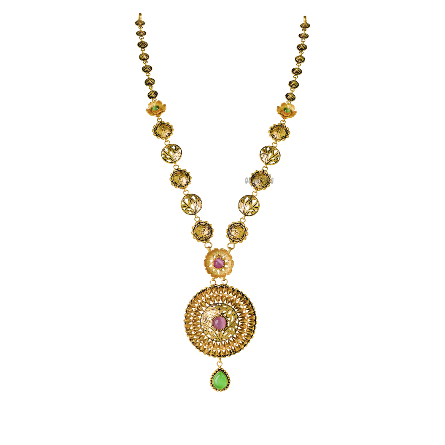 22k yellow gold long necklace is accented with ruby and emerald stones.