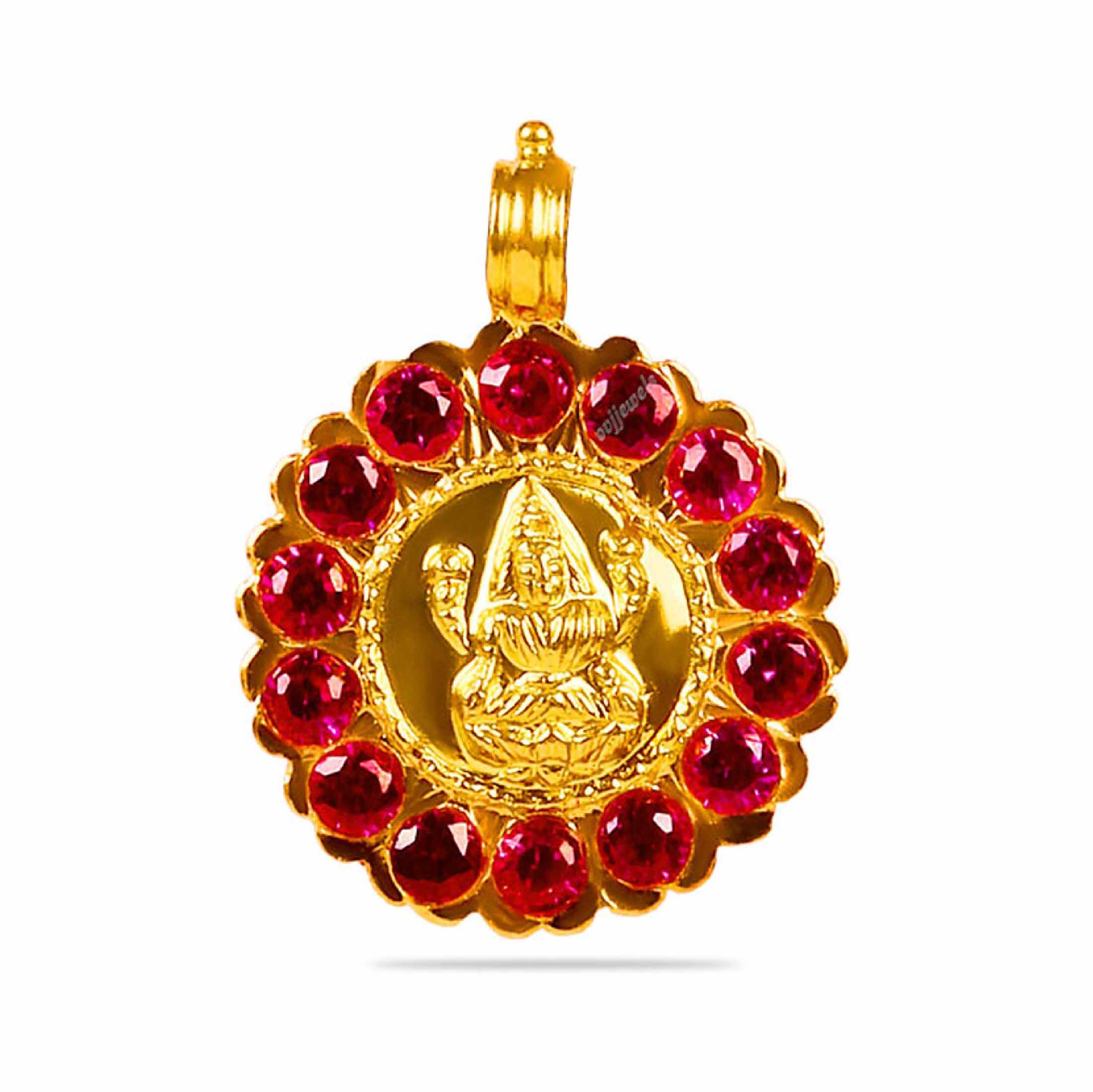 A 22k yellow gold Lakshmi pendant that is elegantly studded with red cubic zircons.