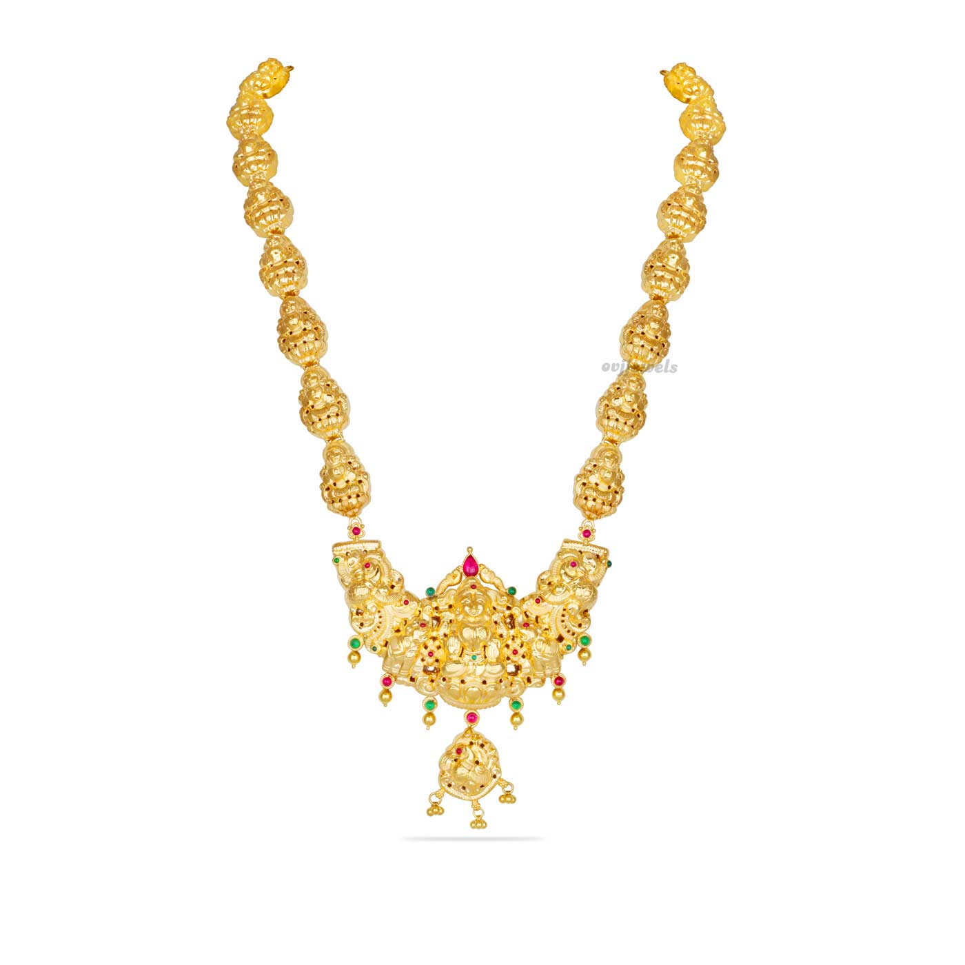 This long necklace belongs to our temple jewellery collection. It is set with uncut kemp rubies and emeralds.