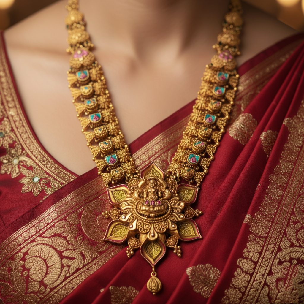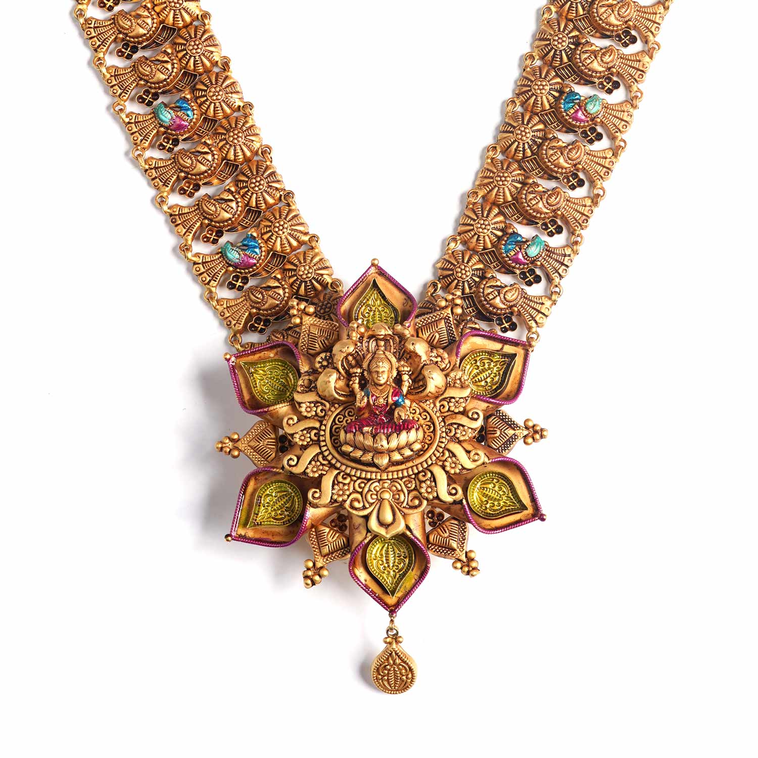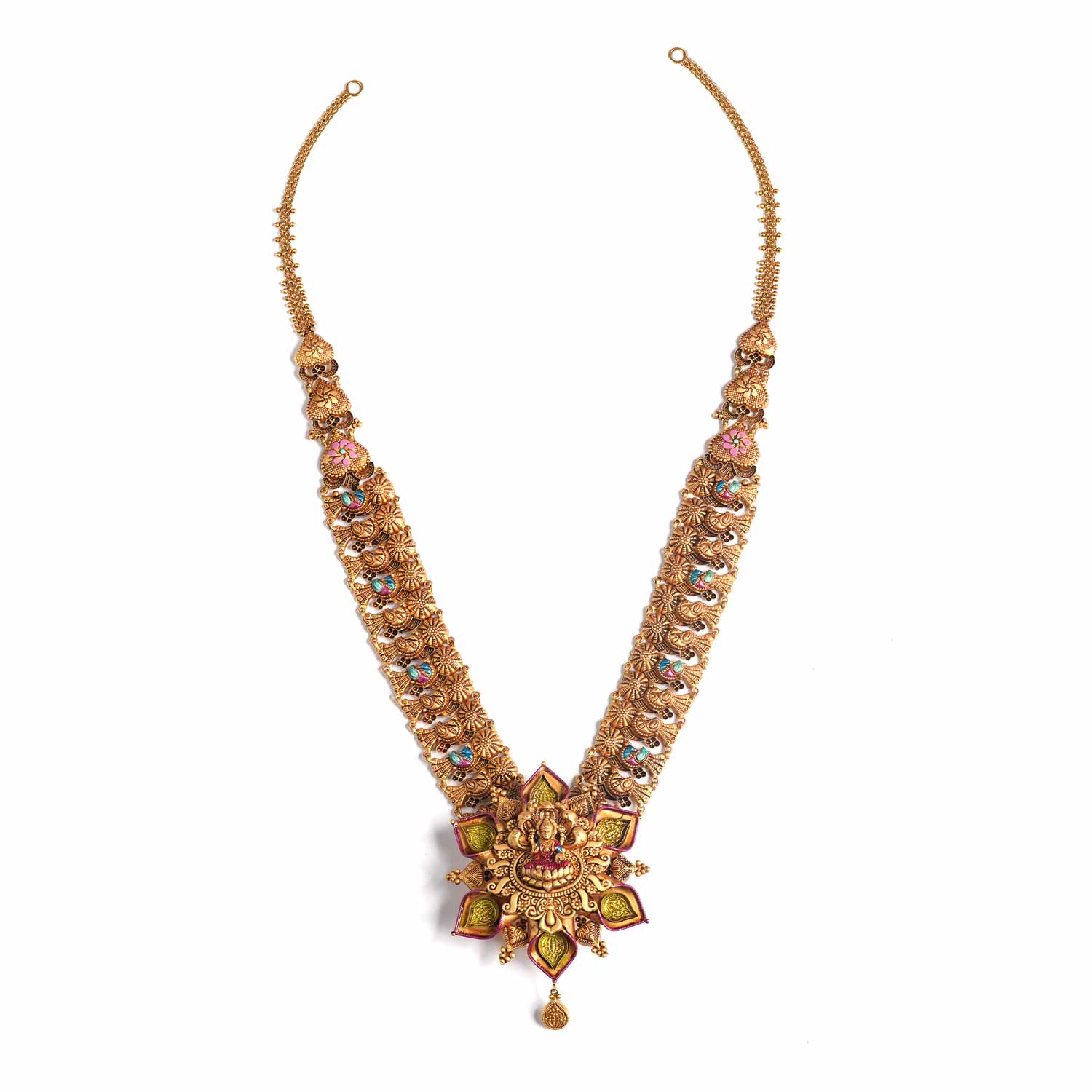 The necklace is anchored by a magnificent, oversized pendant shaped like a blooming Lotus (Padma). At its heart sits a finely carved motif of Goddess Lakshmi, surrounded by petals detailed with lush green and magenta enamel.