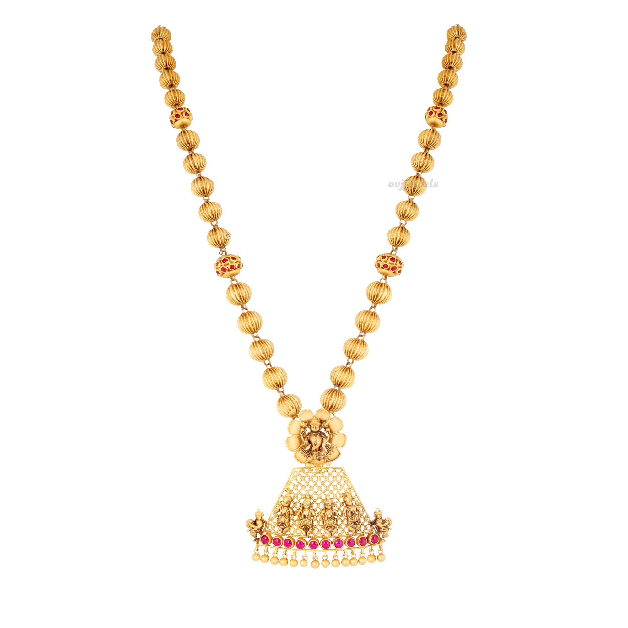 Keep your memories alive with this 22k gold long necklace studded with kemp stones.
