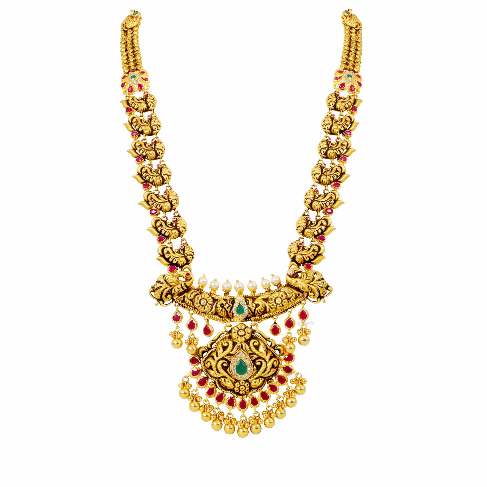 Gold long necklace which are impressively designed in a two step pattern with mesmerizingly hung golden beads.