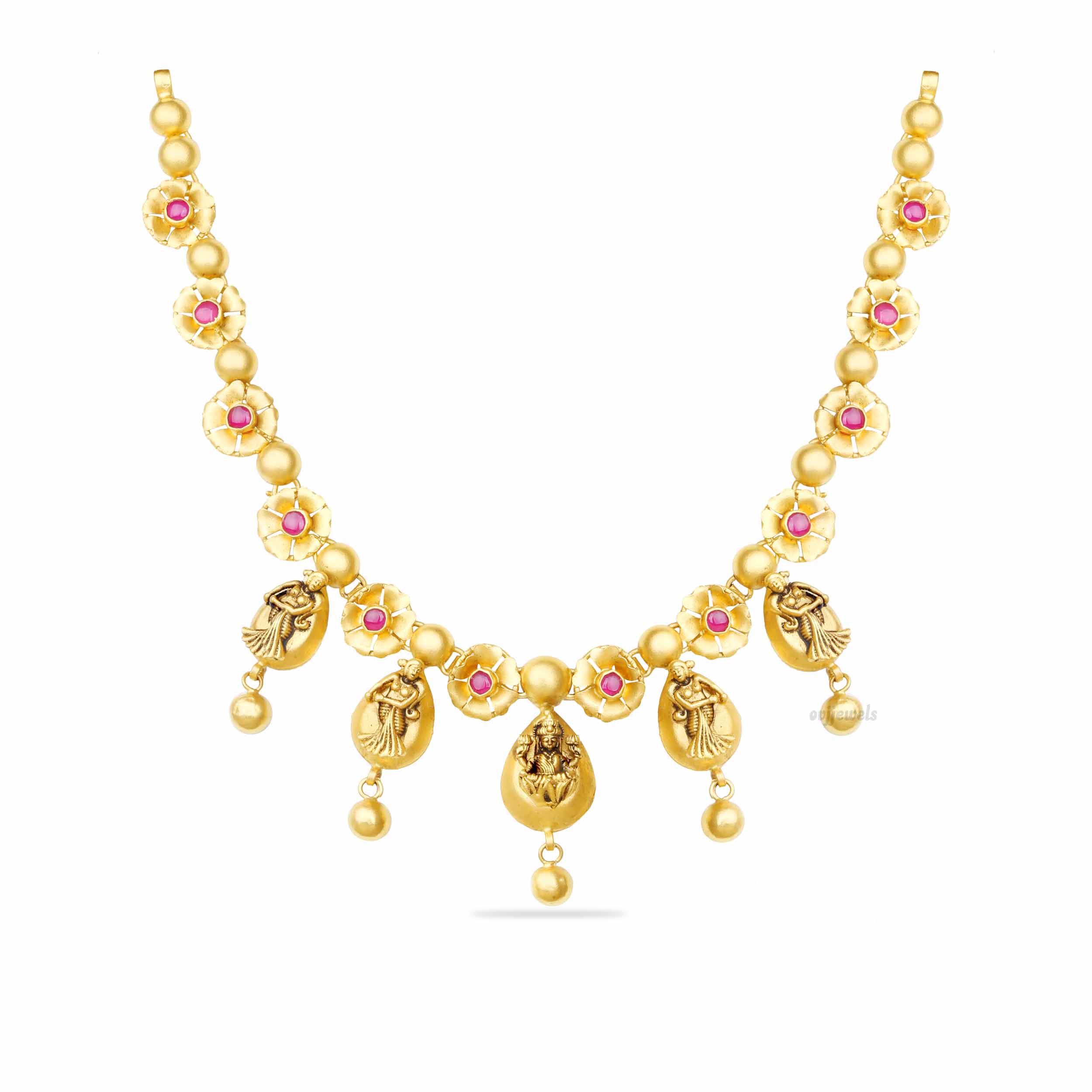 This 22k gold necklace is alluringly accented kemp stones reflecting an enchanting indian jewel tradition.