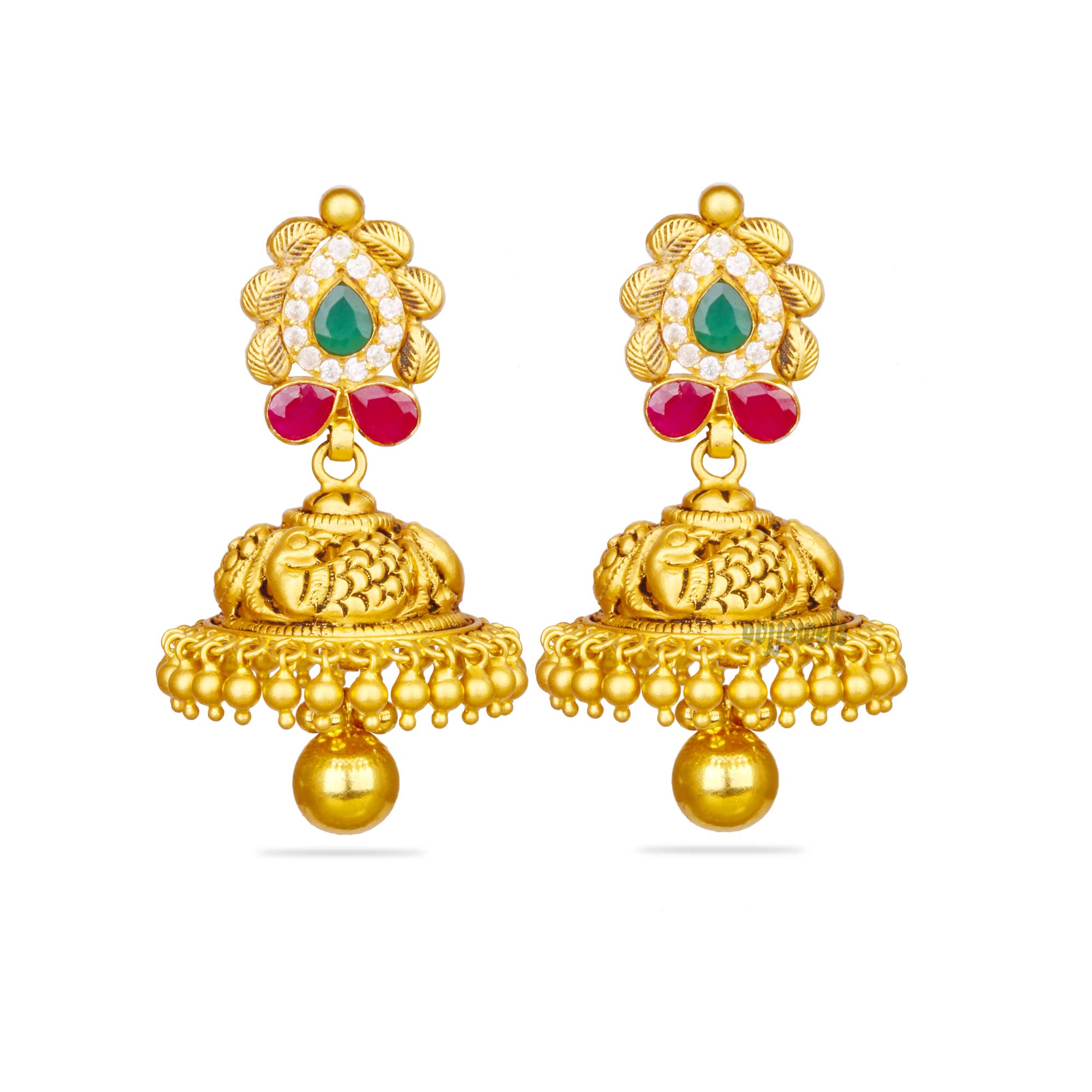 A 22k gold and semi-precious stones compete with each other to impress you in these jhumkkas.