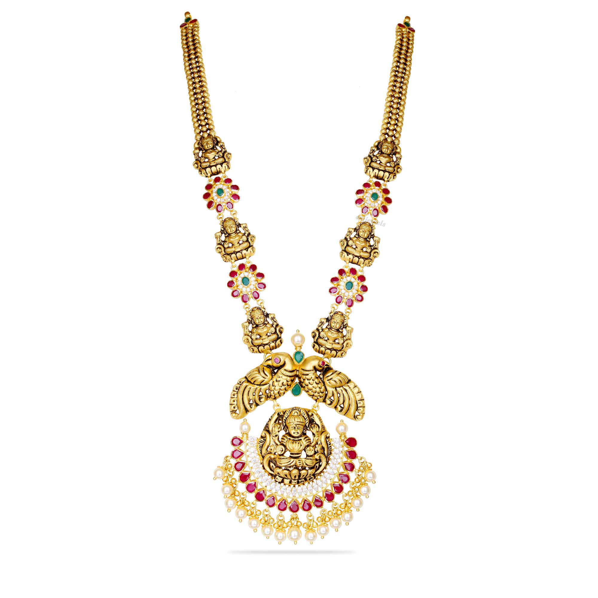 Shimmer under the long necklace in this 22k gold adorned with a ruby emerald stones and pearls .