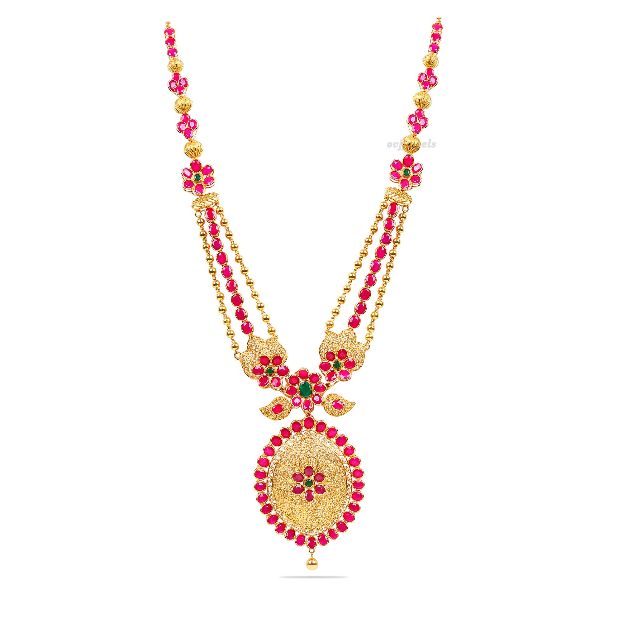 A sleek bodied long necklace furnished with shiny ruby and emerald stones.