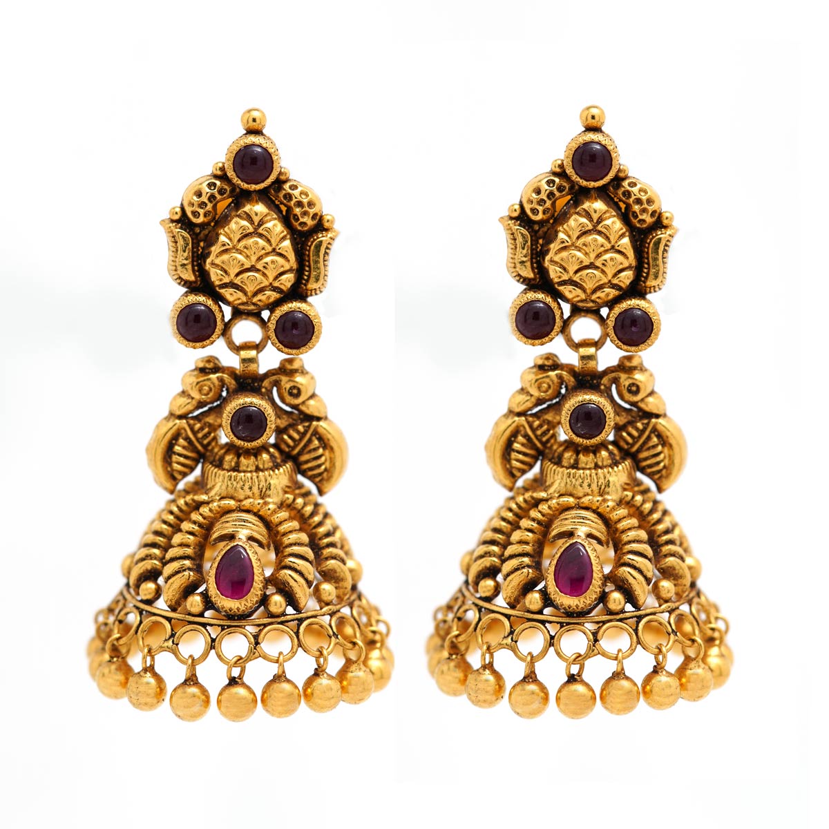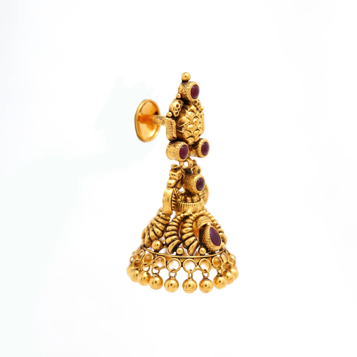 antique jhumka earrings featuring an intricate Temple Jewelry design. These unique 22K gold bell-shaped earrings are embellished with rich ruby stones,