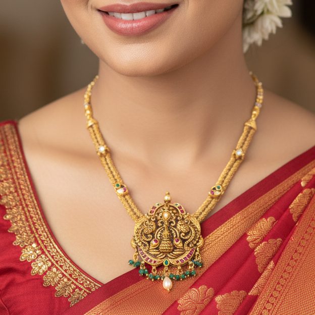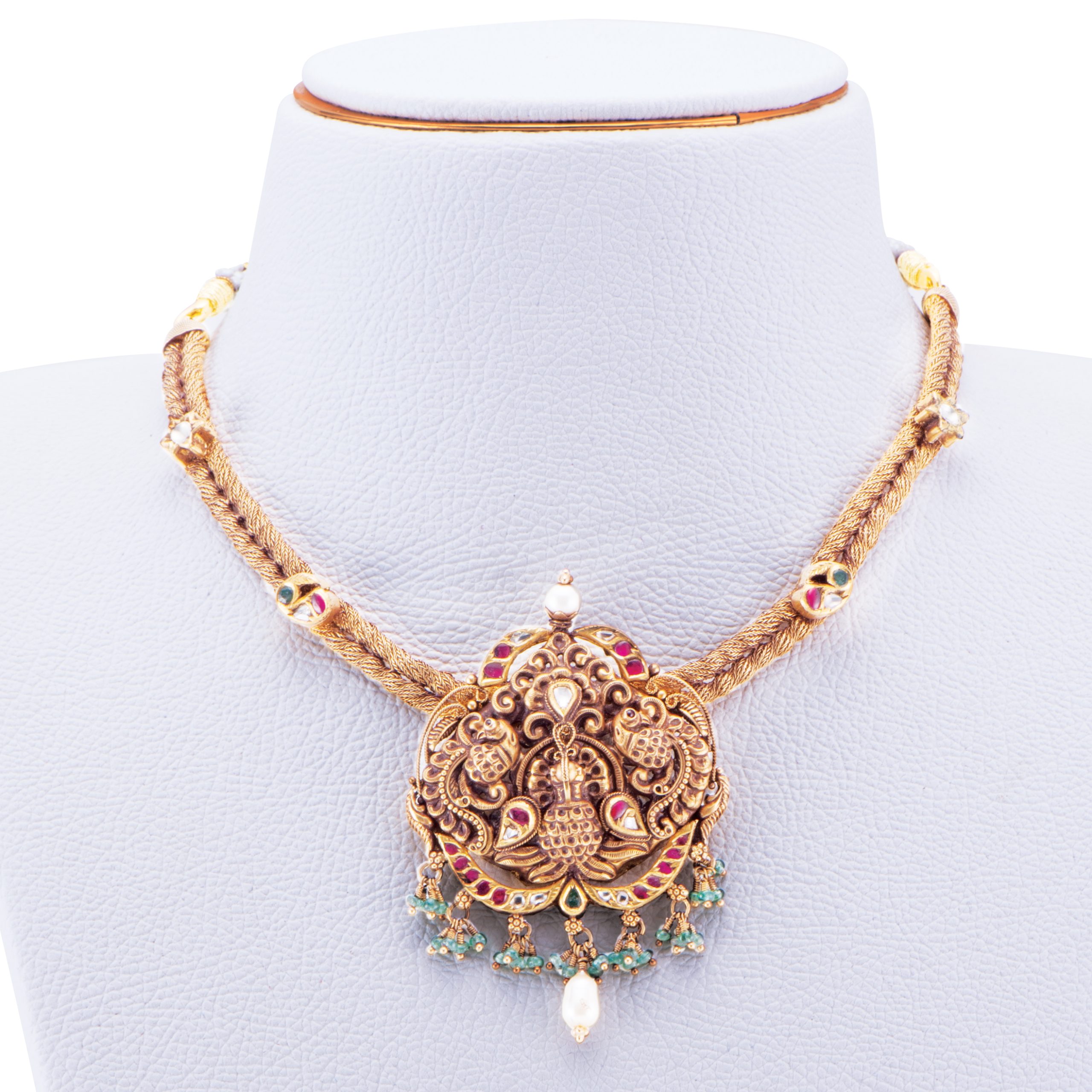 Elegant 22K gold multi-deity spiritual Necklace with ornate filigree pendant, emerald and ruby gemstones, pearl detail. Premium lightweight temple & festival jewelry