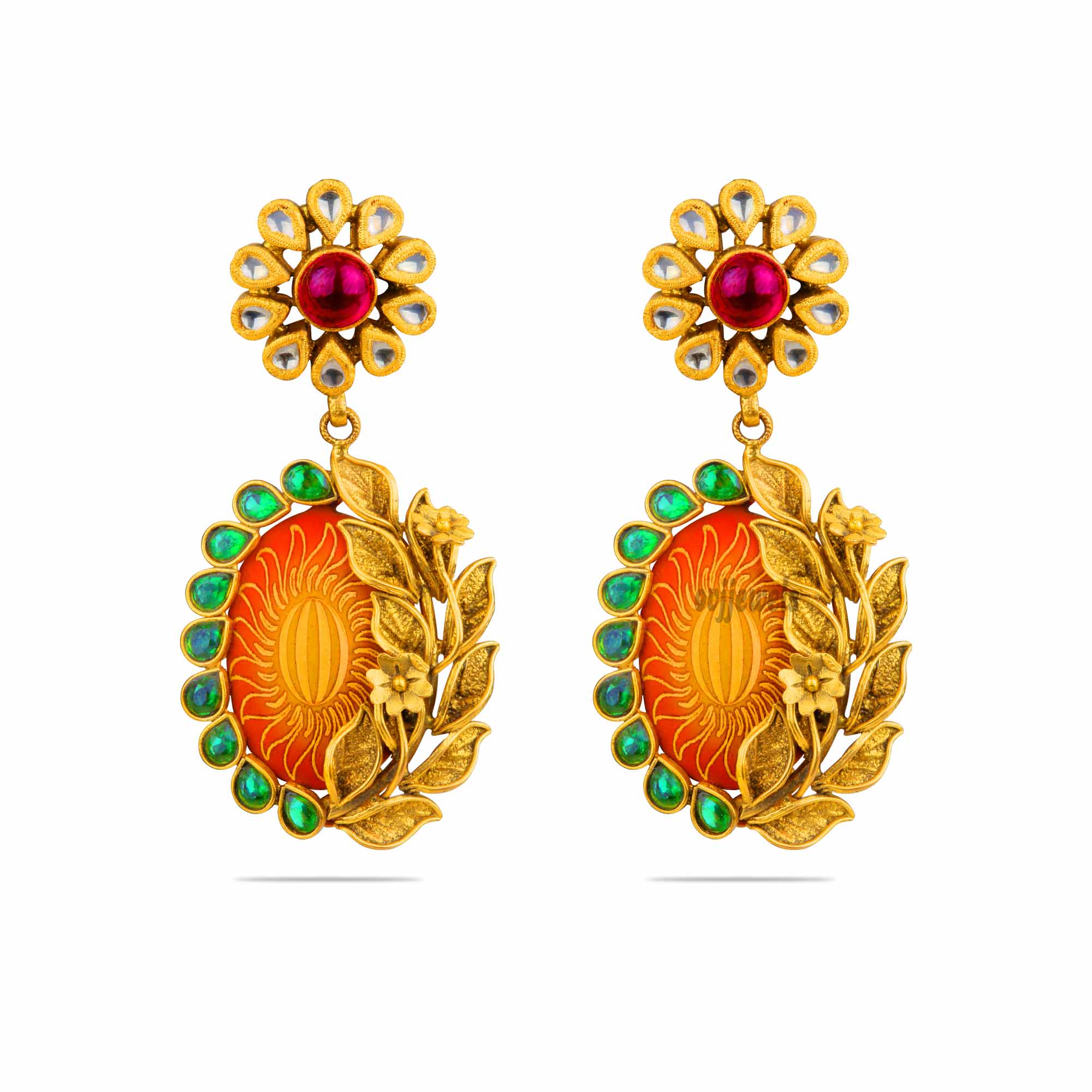 These gorgeous gold earrings embedded with enamel work an unusually cut design that you may have never come across.