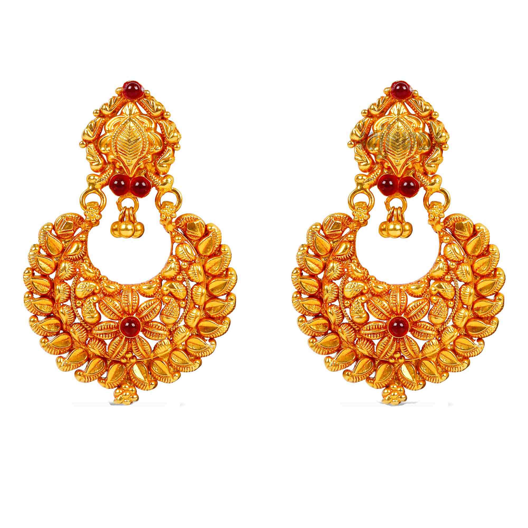 This 22k gold earring is alluringly accented with ruby stones, reflecting an enchanting indian jewel tradition.