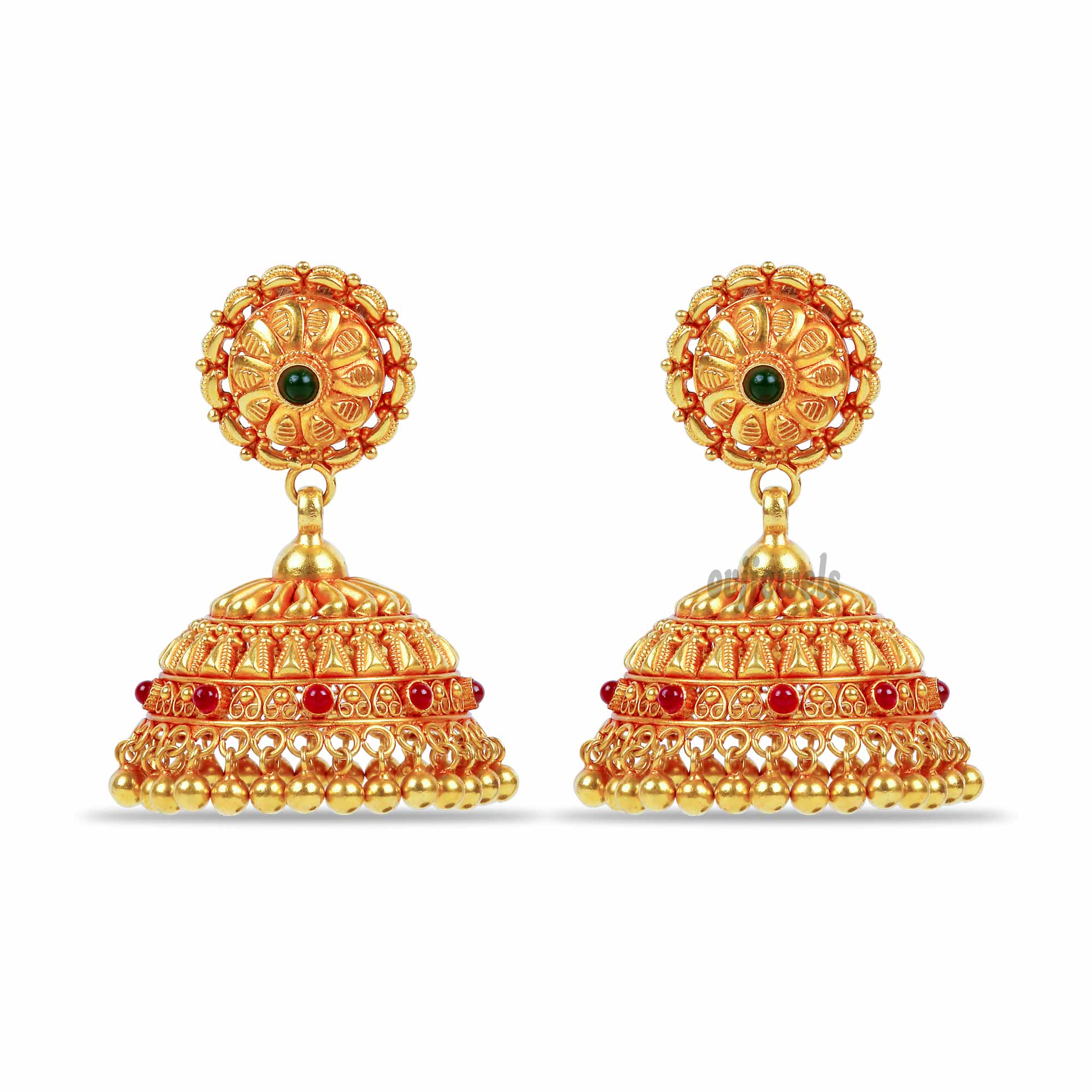 This ethinic jhumka features the floret and is embellished with various and shapes of ruby emerald stones.