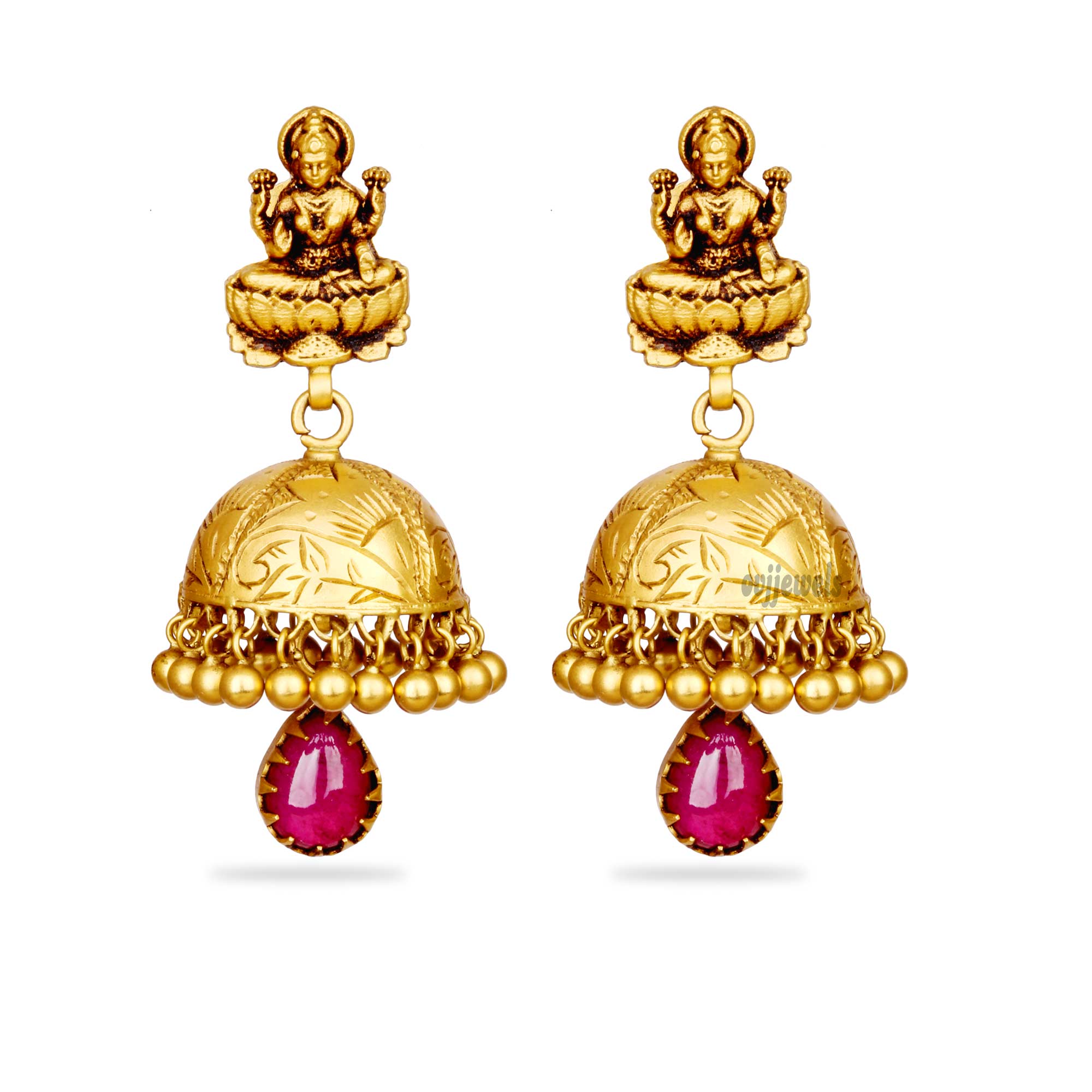 Angelic beauty is ageless. Like this pair of 22k gold lakshmi jhumkka embellished with kemp stones.