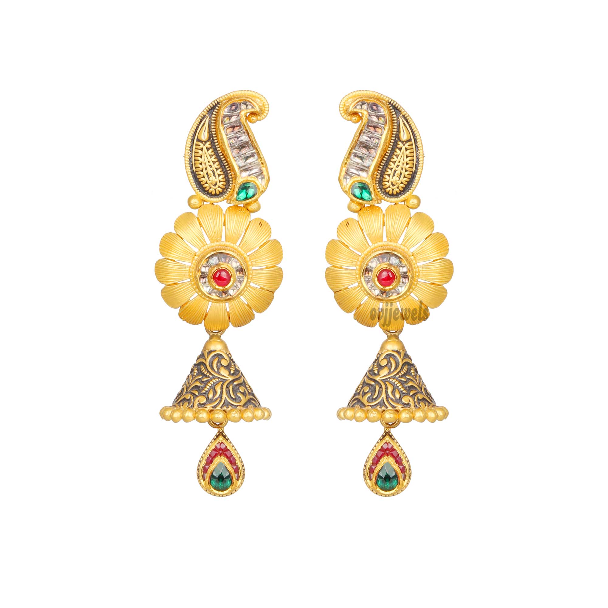 This 22k gold is studded with kundan stones and handcrafted with creative antique artwork.
