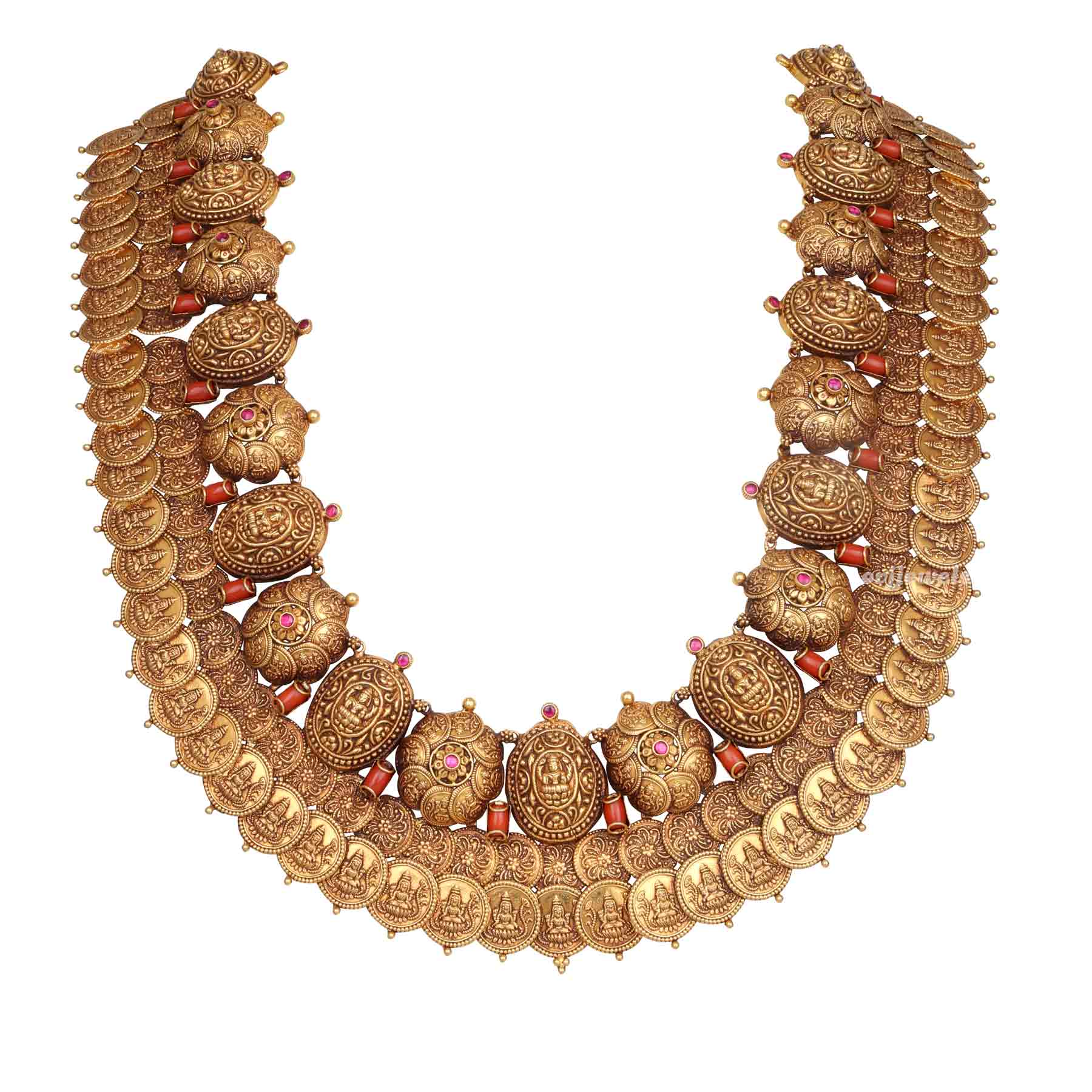 Embrace the classic styling of the vintage era with this 22k long necklace embedded with designer coral and kemp stones.