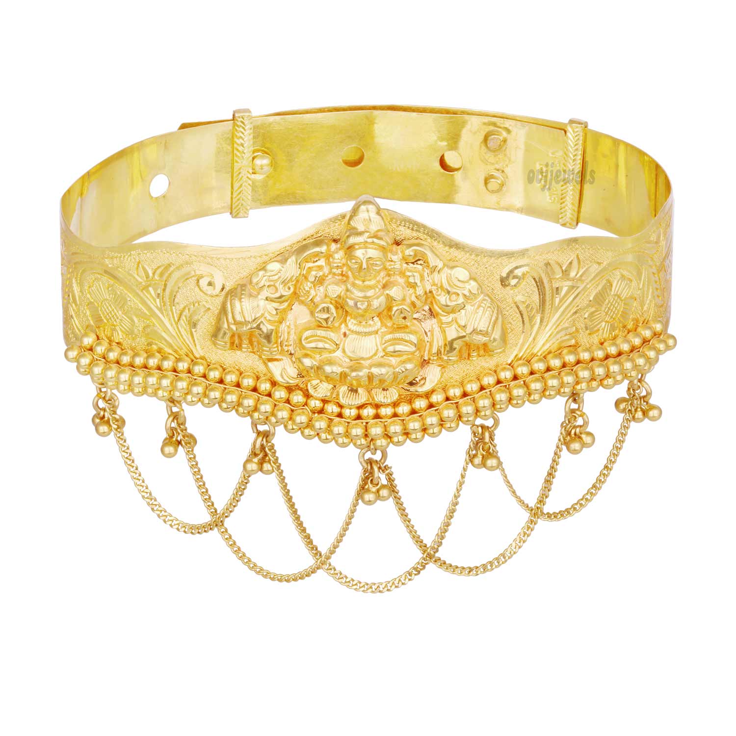 22k yellow gold adjustable vanki or arm-band, featuring the goddess Lakshmi surrounded .Further detail is added by the hanging scallops of gold chains, beads and bells.