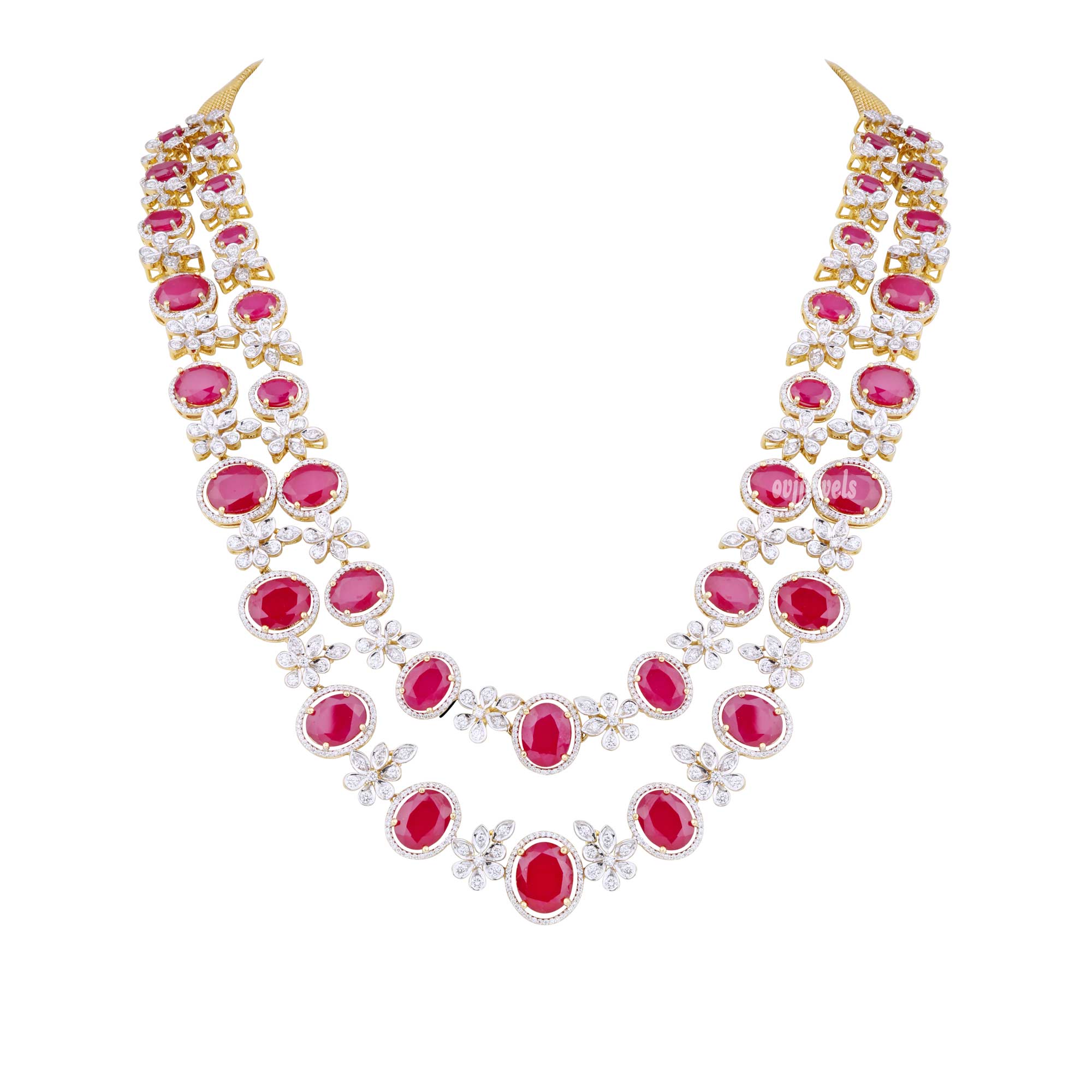 A spectacular 18k gold necklace embossed with a dashing ruby stones and accented with round brilliant diamonds.