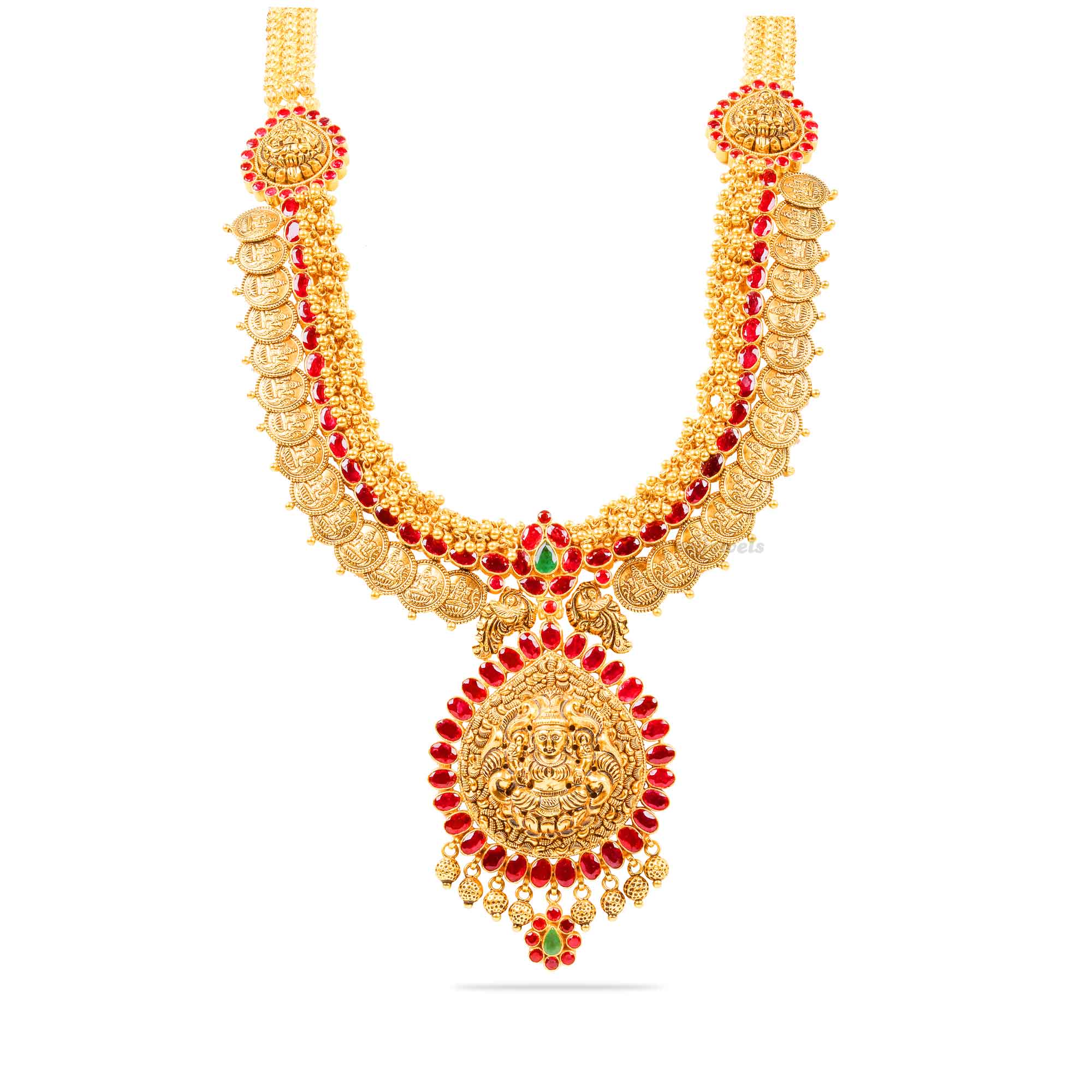 A stunning 22k gold long necklace adorned with kemp and emerald stones.