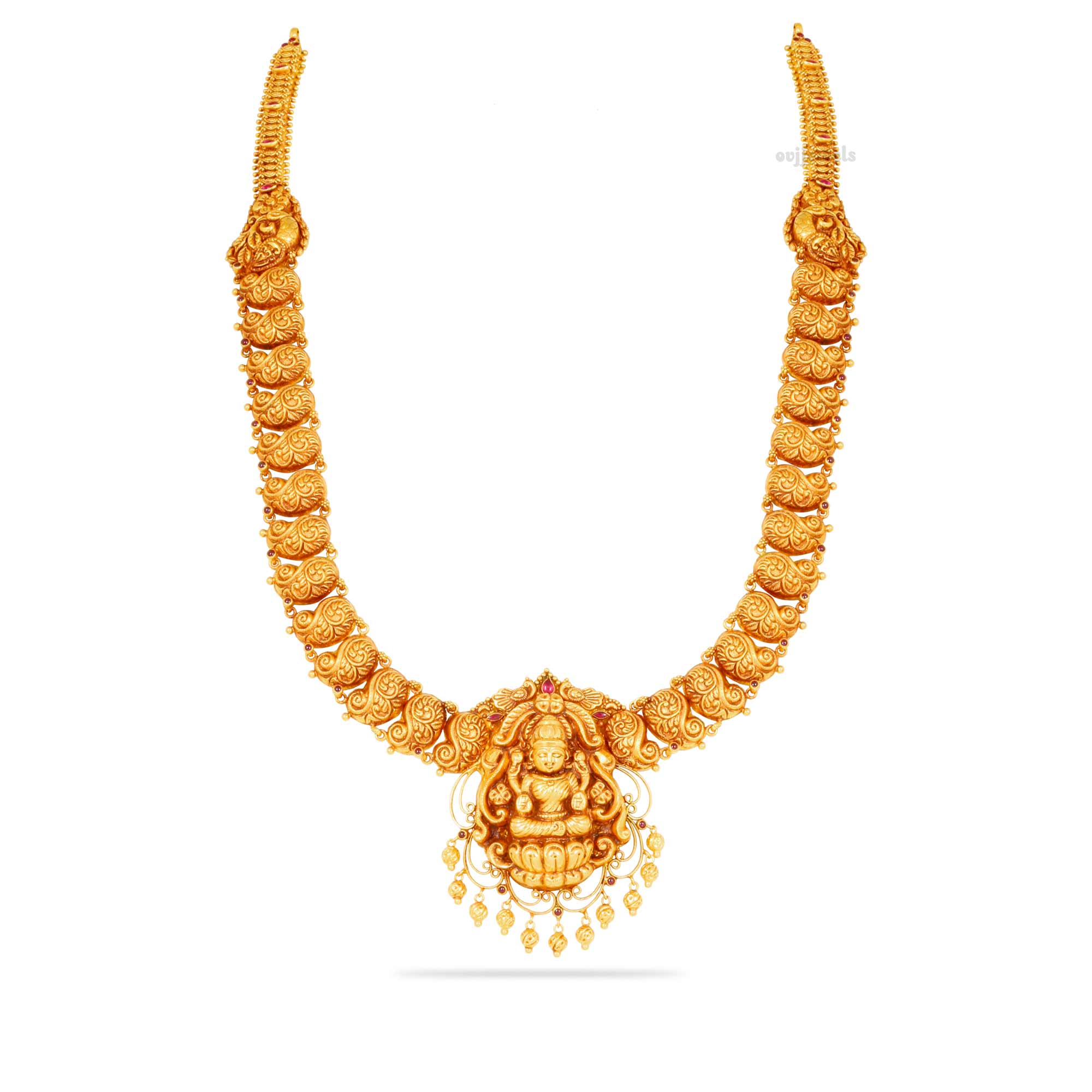 Breathe live into the modern trends with this 22k gold long necklace studded with royal ruby stones.