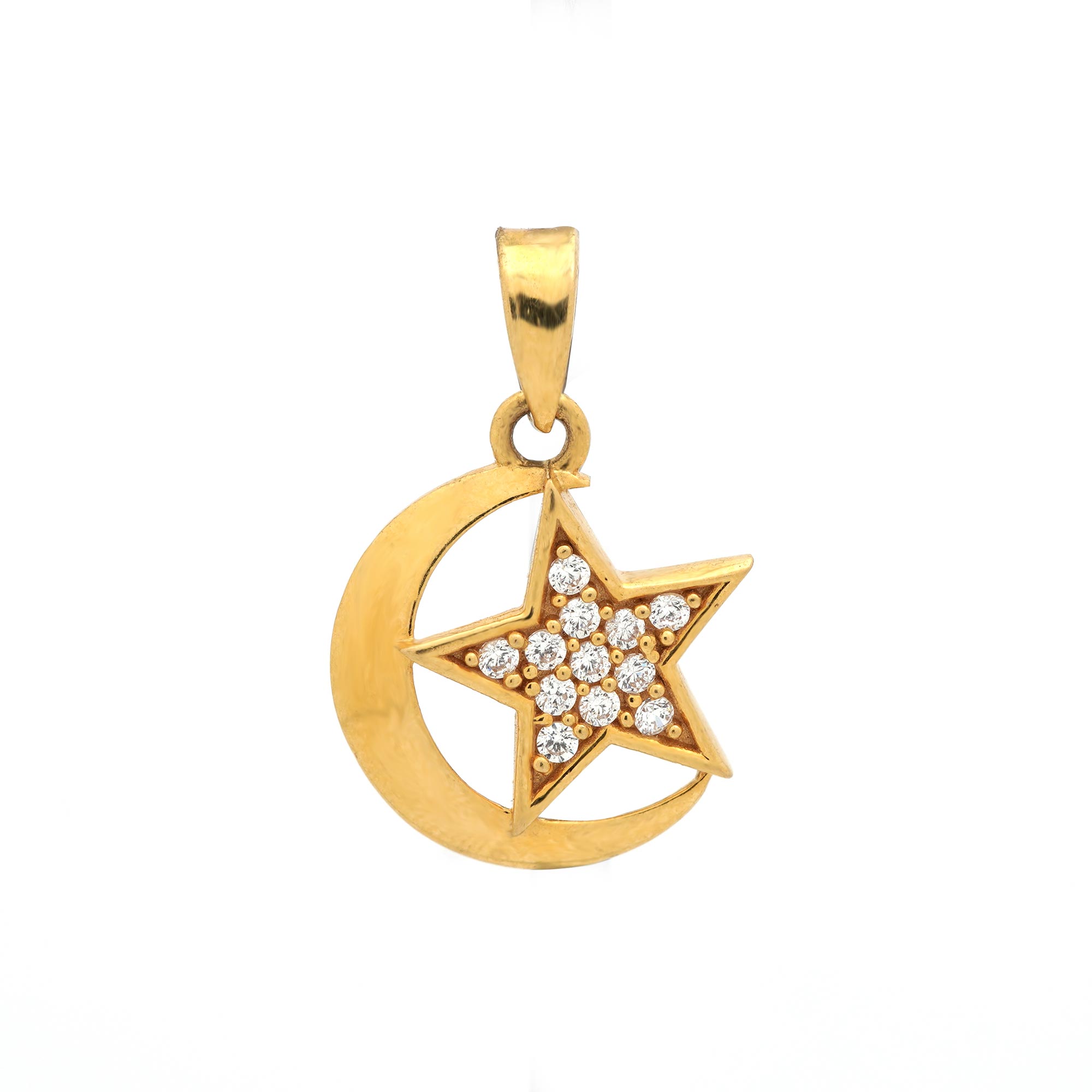 Beautiful moon with star gold pendant embellished with sparkling stones. A symbol of faith, elegance, and style, perfect for daily wear or gifting