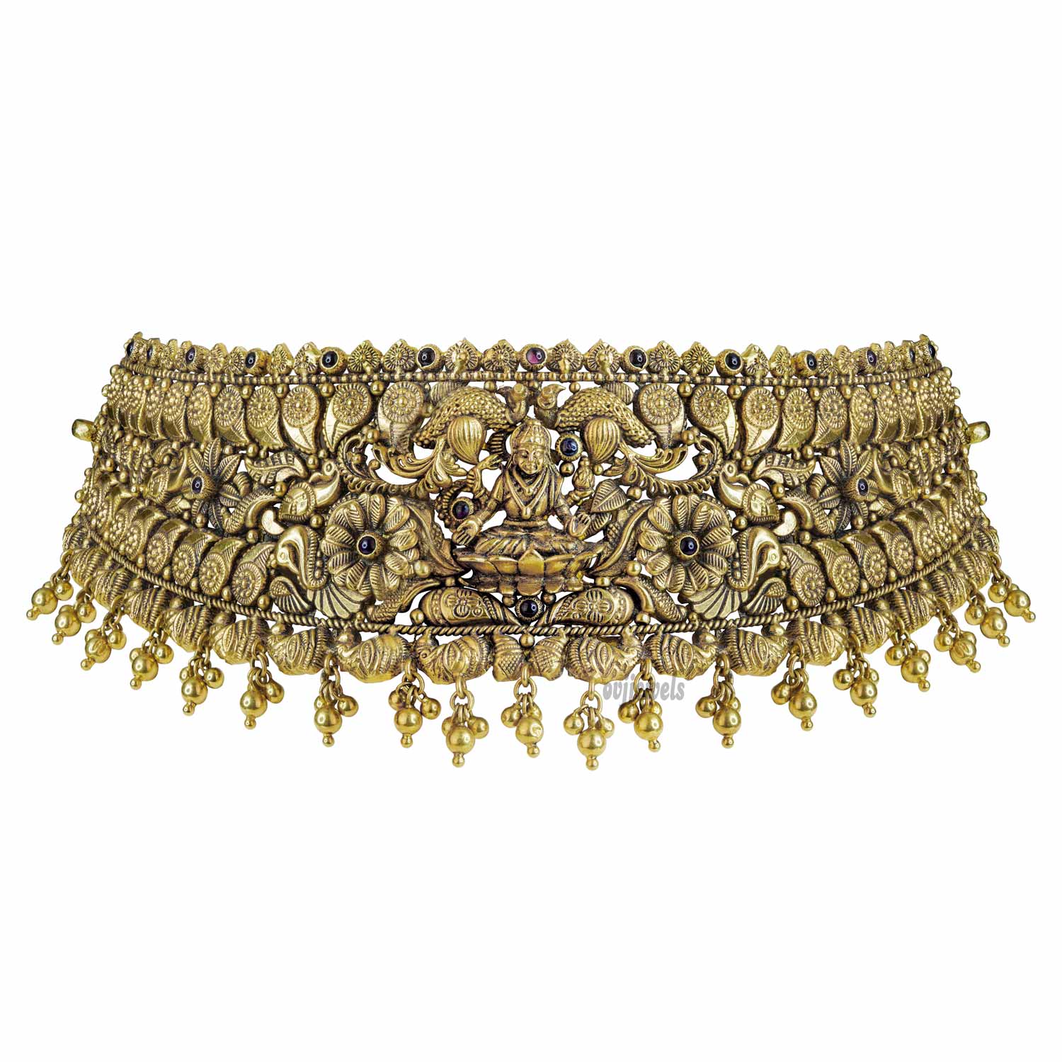 Meticulously designed, this 22kt gold choker is a bridal extravaganza, adorned with kemp stones and hanging golden balls.