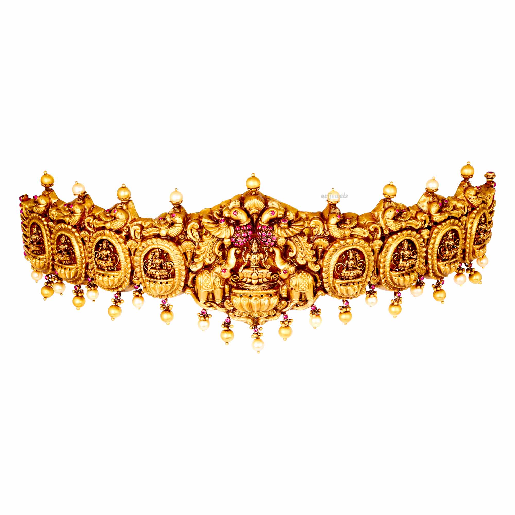 This 22k gold ottiyanam is highlighted with kemp stones and pearl balls to make it look trendy.