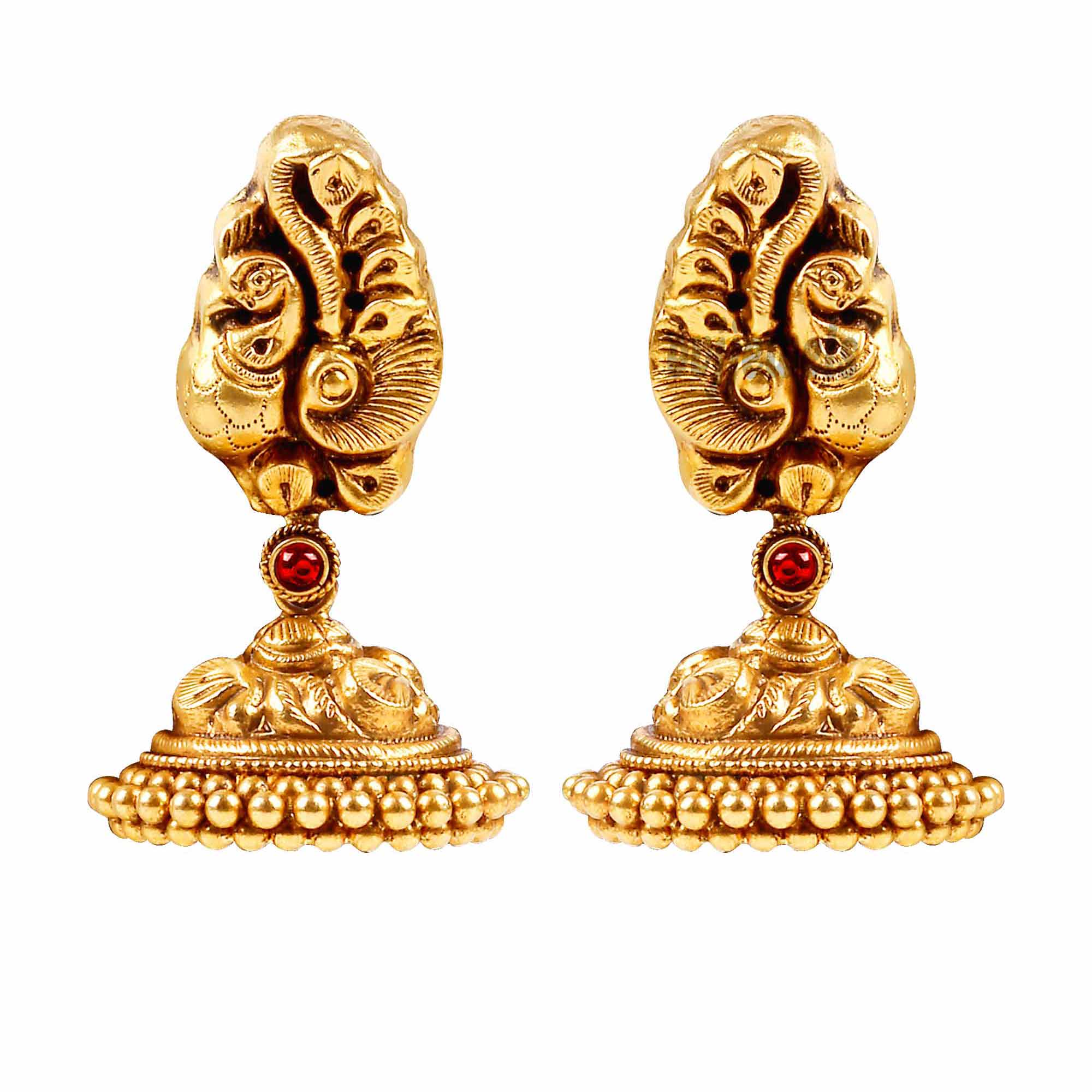 This 22k gold nagas jhumkka is alluringly accented with kemp stones, reflecting an enchanting indian jewel tradition.