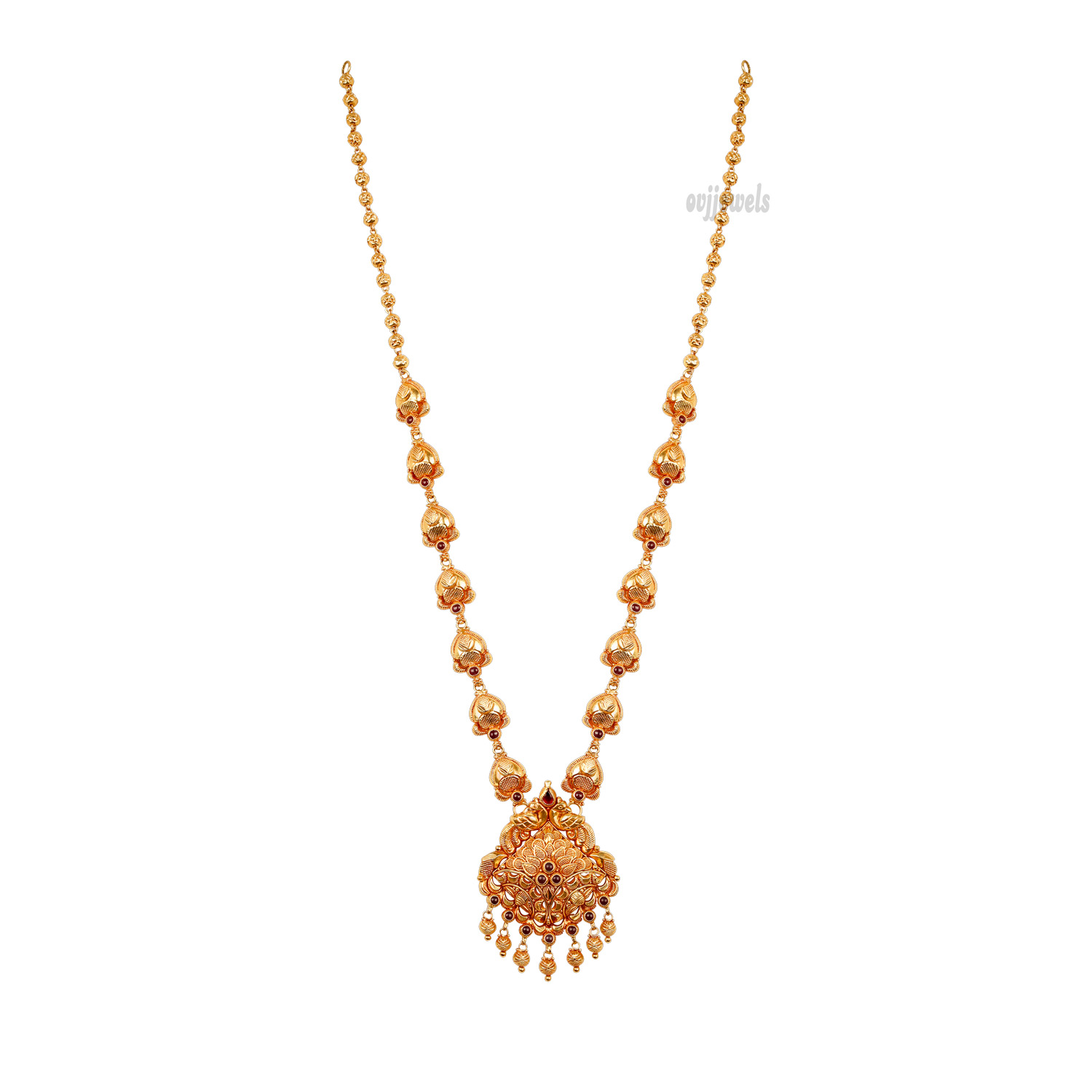 Look more charming with this 22kt gold long necklace with it’s matching earring prettified in a distinct pattern and studded with mozonit,fancy stones.