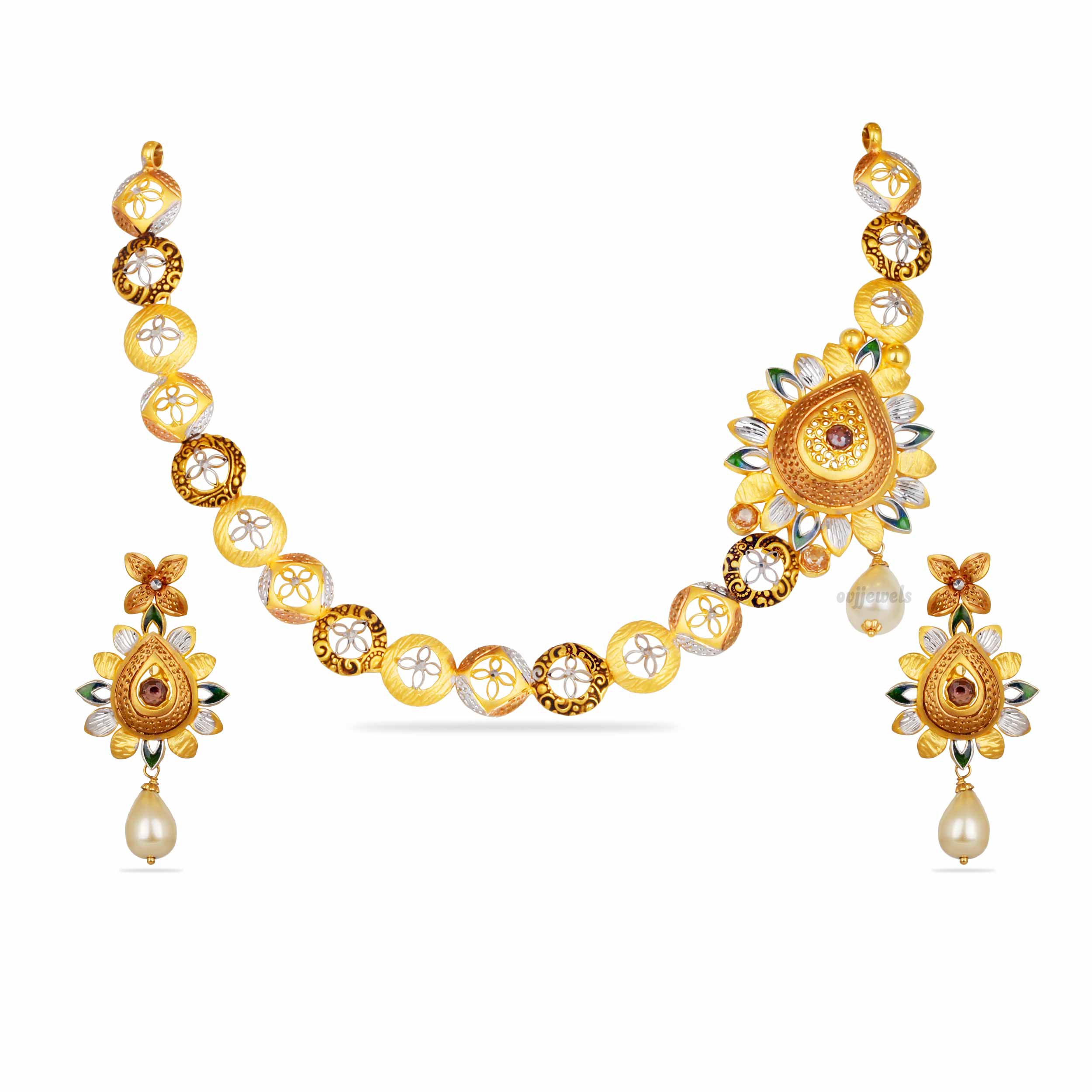 Simplicity meets stunning in this 22k gold necklace adorned with rhodium finish as a pearls drops.