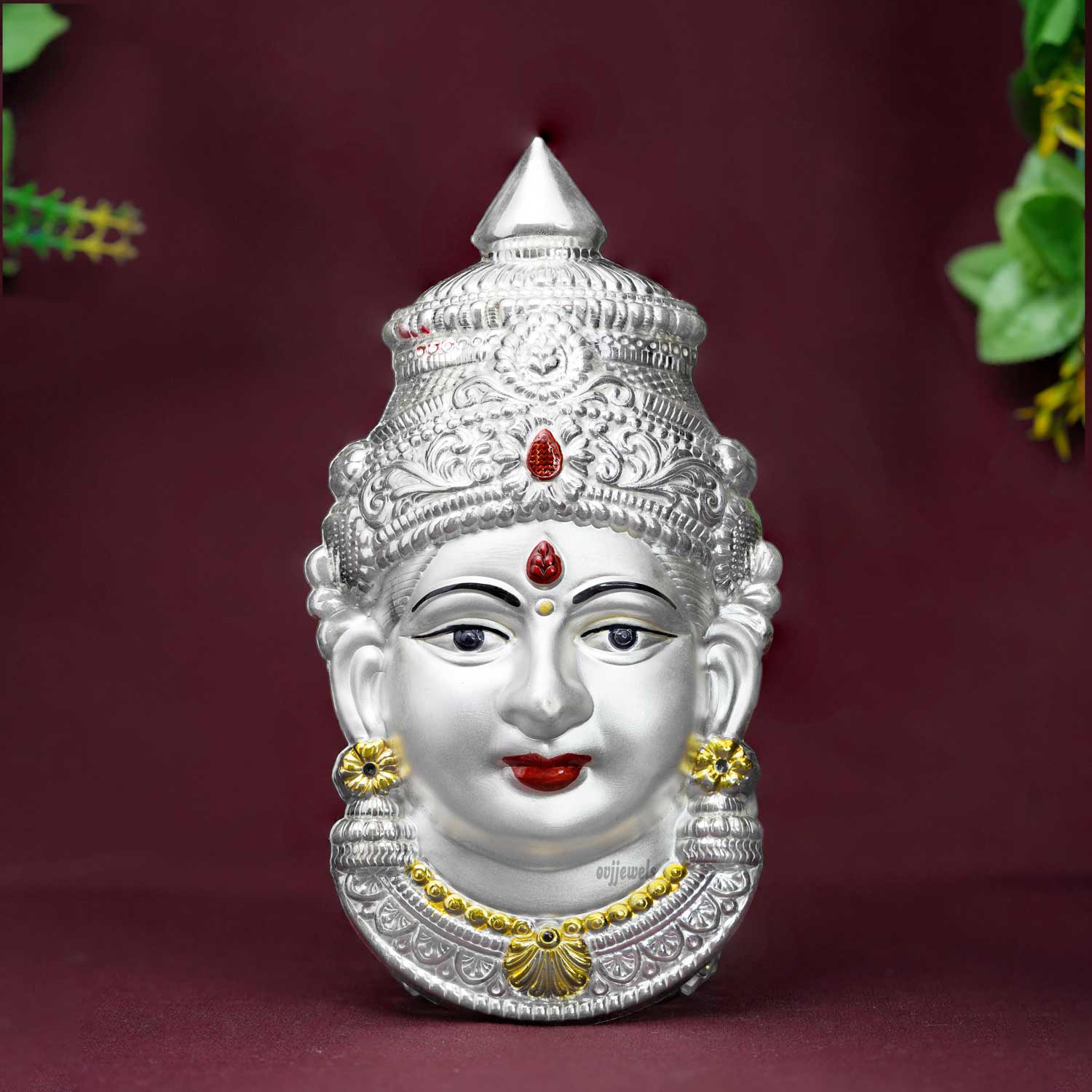 The Silver Amman Mugam, a stunning and sacred representation of the divine goddess Amman in a mugam (face) form. This exquisite piece is meticulously crafted with intricate details, capturing the beauty and grace of the goddess.