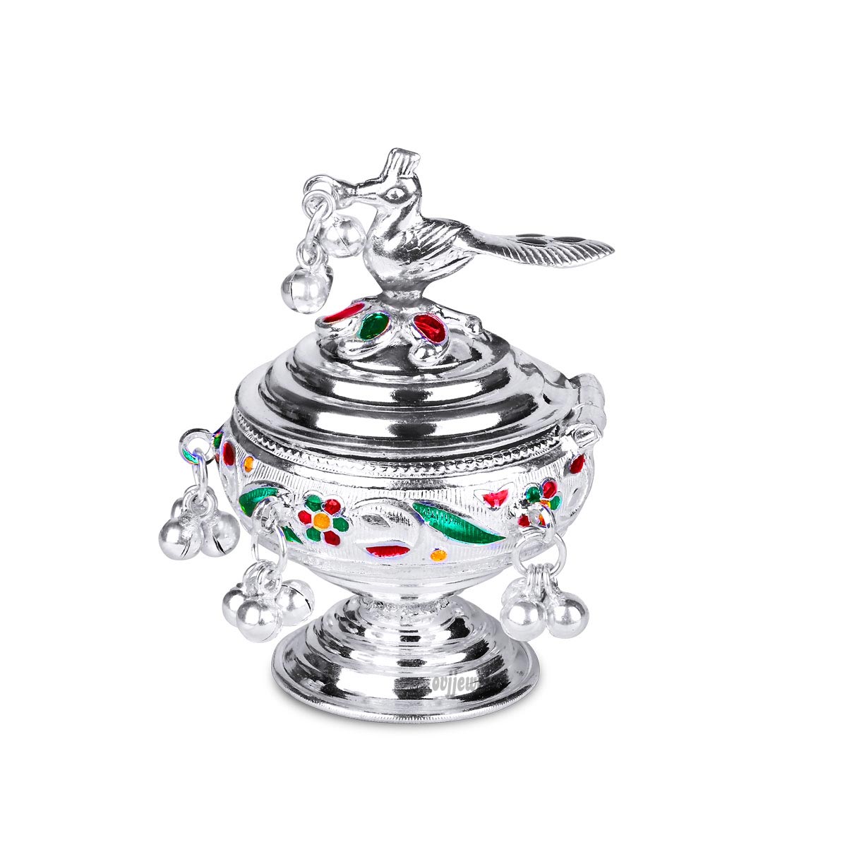 Beautifully designed silver kumkum chimil. The hanging balls add a charm to the kumkum chimil.