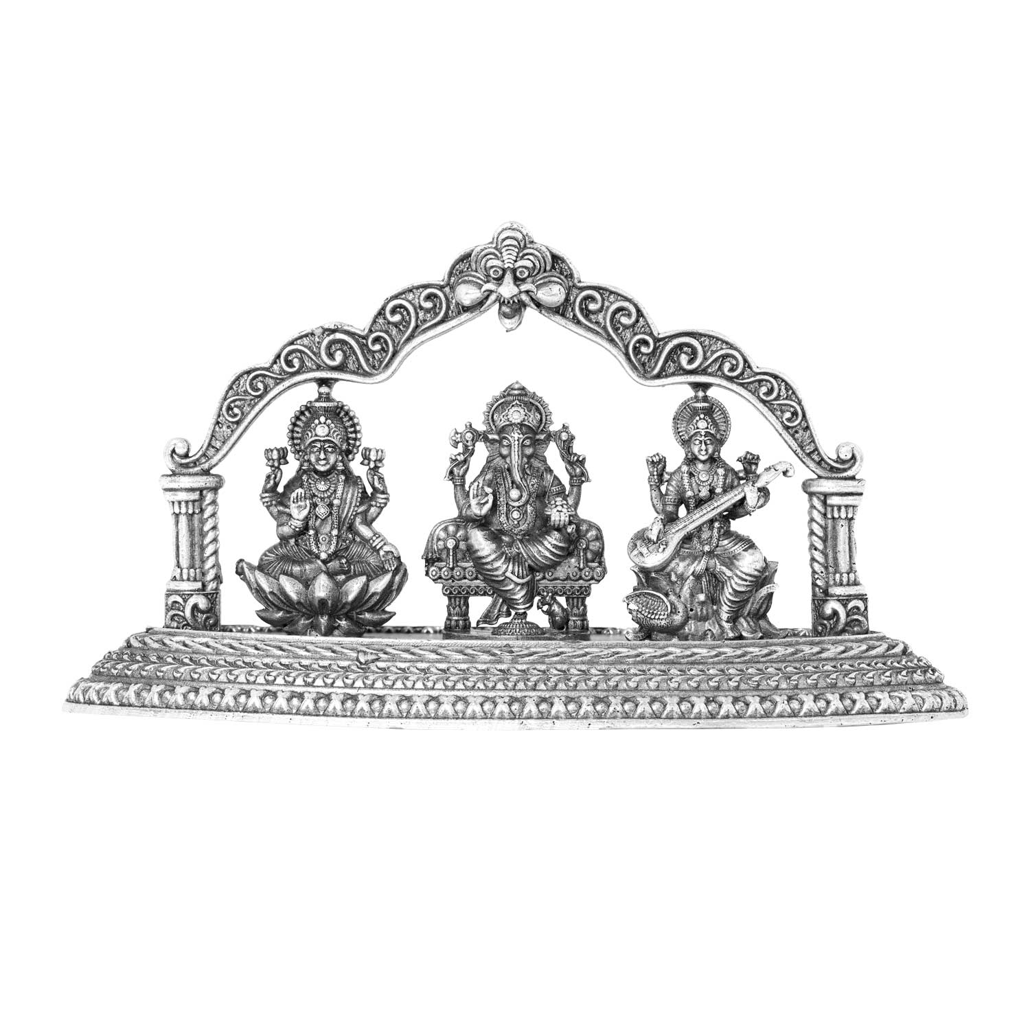 A 92.5 silver Mahalakshmi,Ganesha,Saraswathi Idol idol is a beautiful and auspicious piece of art. The antique idol is intricately crafted by skilled artisans