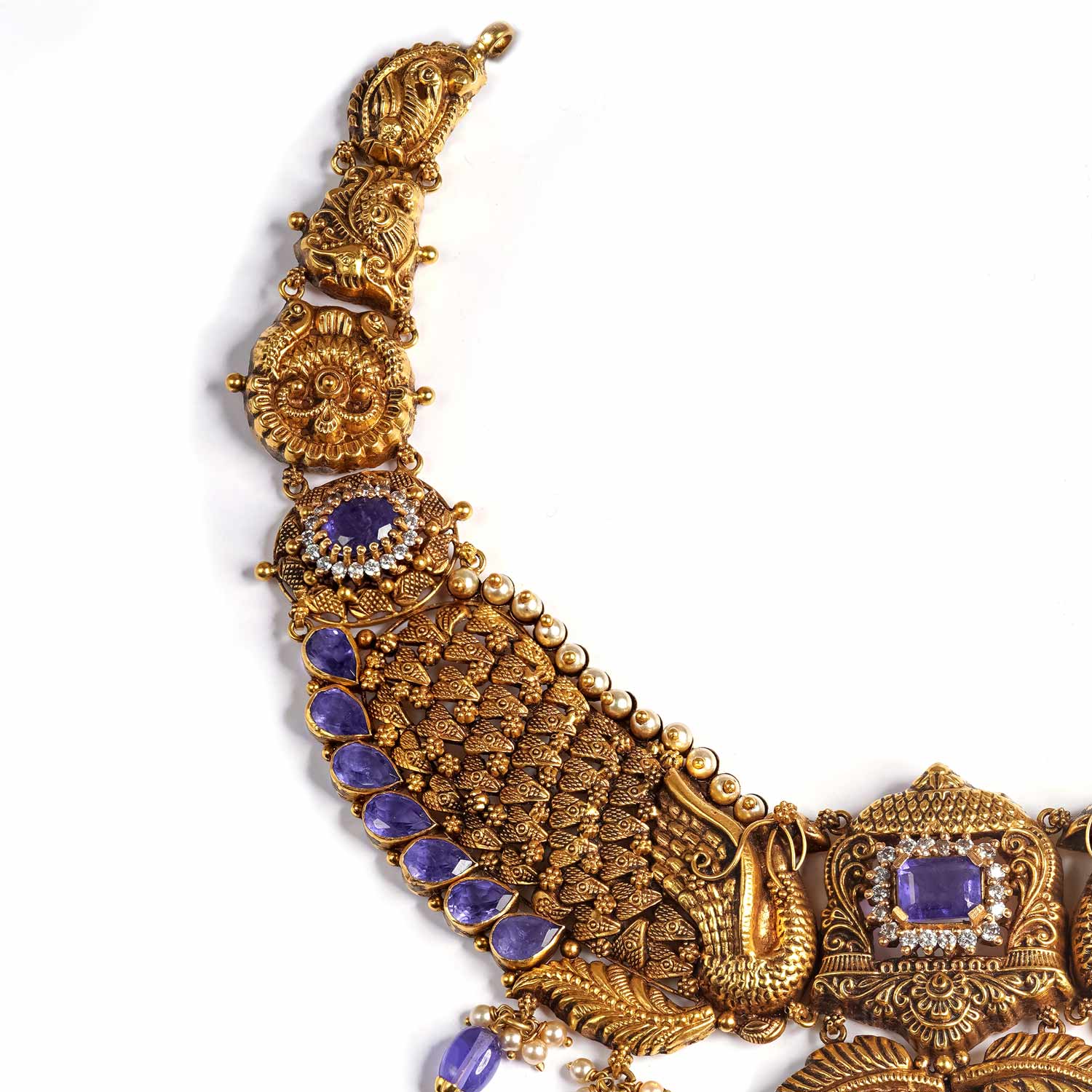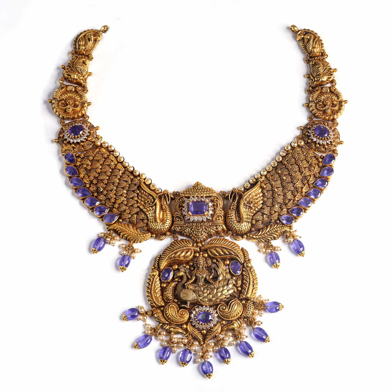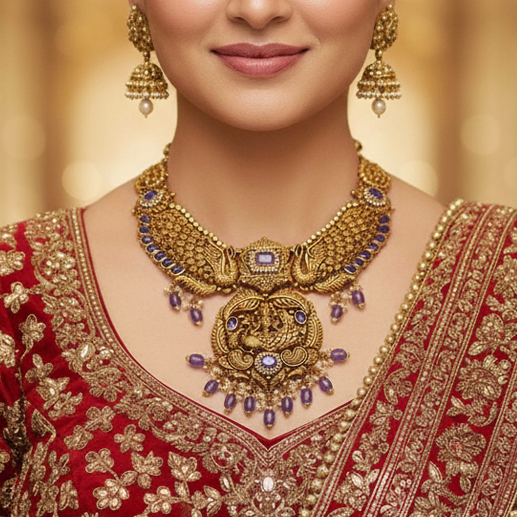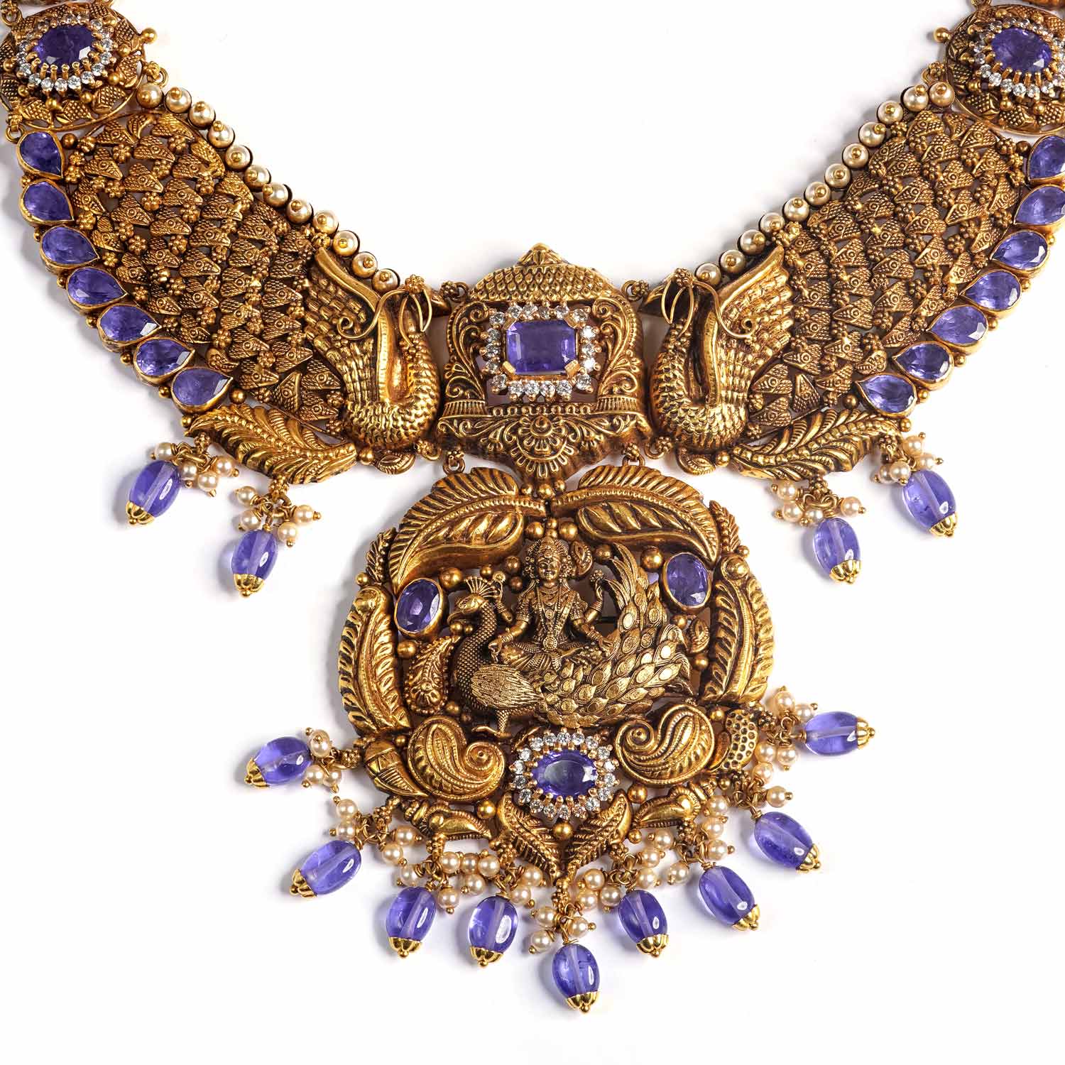 Antique Gold Temple Necklace, a rare masterpiece that combines traditional South Indian artistry with a unique contemporary color palette. This heavy necklace is designed for the bride who seeks divinity and distinctiveness.