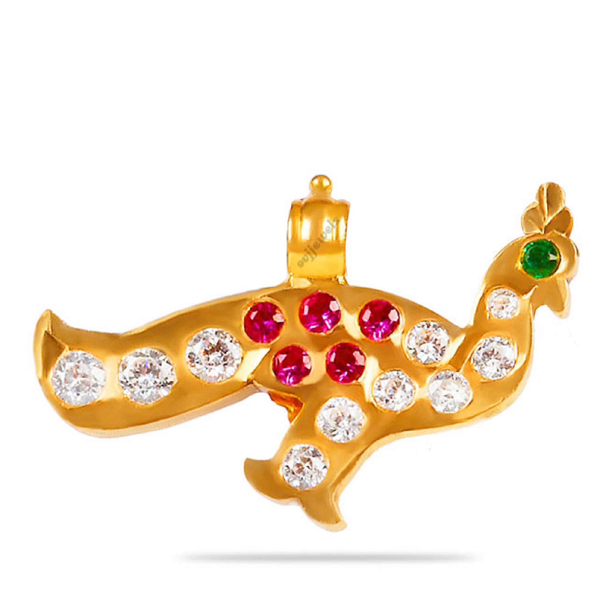 A 22k yellow gold thaali elegantly studded with cubic stones which is also a perfect addition to the Mangalyam Collection.