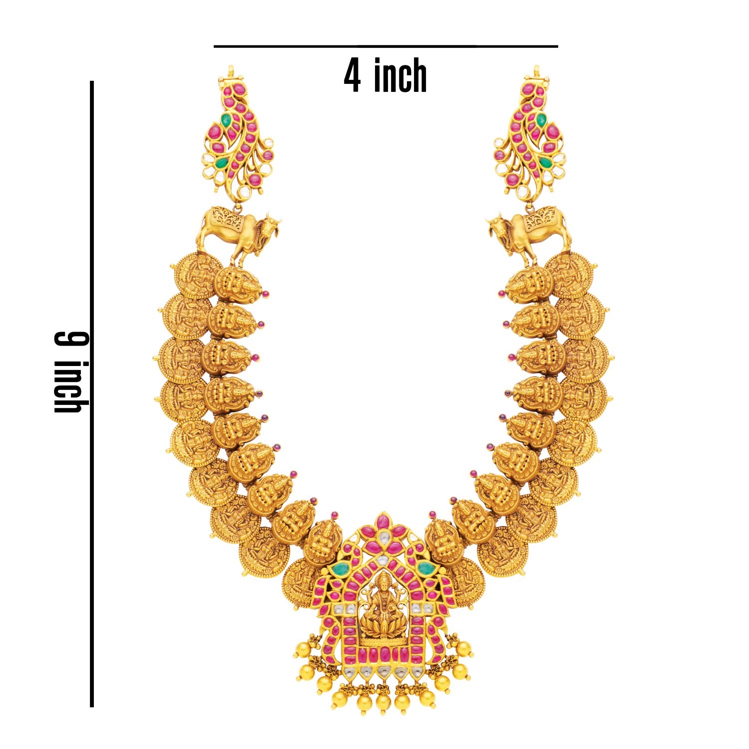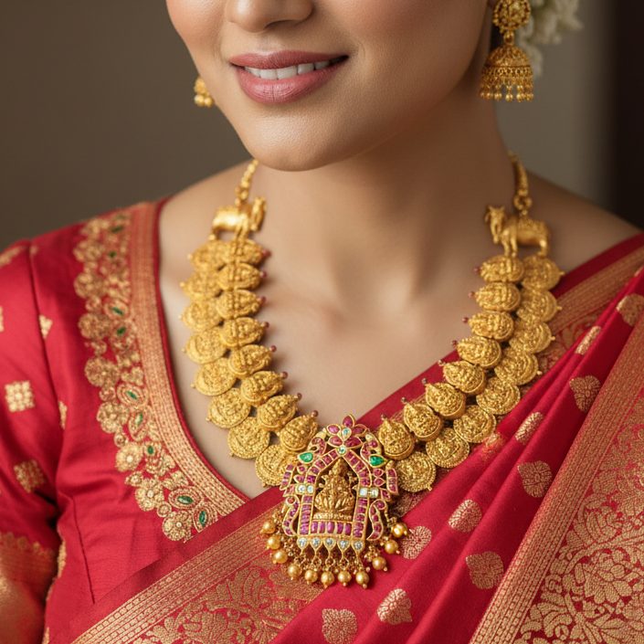 Divine 22K gold Lakshmi temple necklace featuring a Lakshmi deity pendant, granulated gold coins, ruby gemstones, and pearl drops. Premium bridal & spiritual jewelry