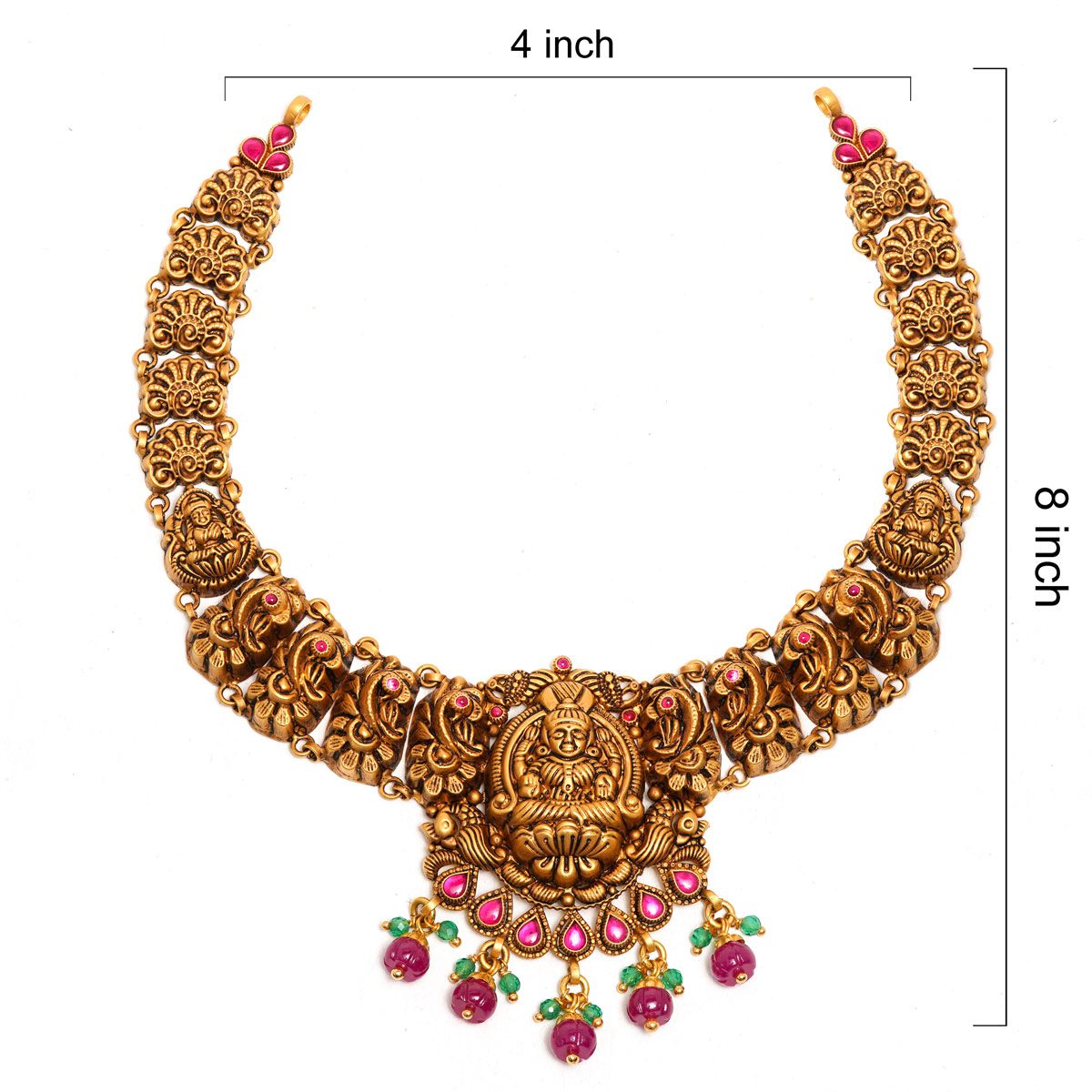 The centerpiece features a detailed engraving of Goddess Lakshmi seated on a lotus, surrounded by majestic peacocks and floral artistry. Accented with vibrant pink stones and dangling emerald-green beads, this Temple Jewellery masterpiece is the perfect heirloom for brides and festive occasions.”