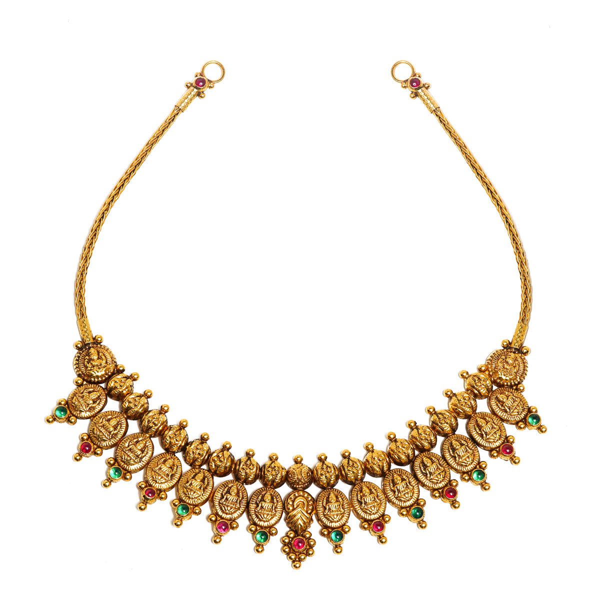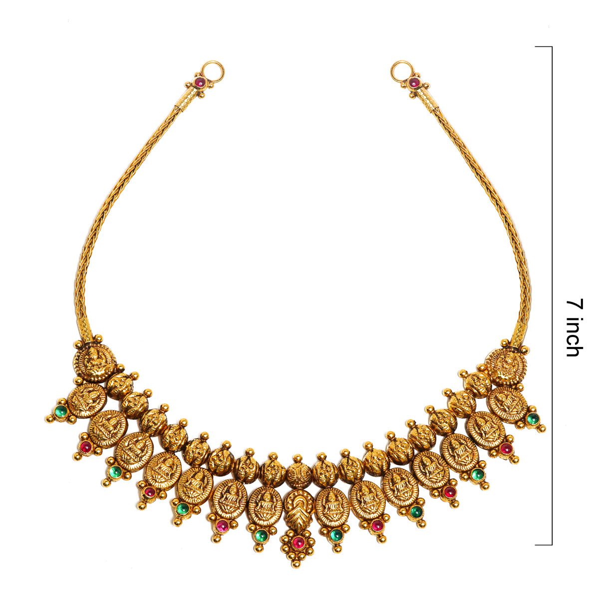 Experience the grandeur of heritage with our Royal Traditional 916 Gold Lakshmi Kasulaperu Attigai Necklac. A stunning blend of divine coin motifs and precious kemp stones, this temple jewellery masterpiece adds a regal touch to your silk sarees. Shop the look now.”