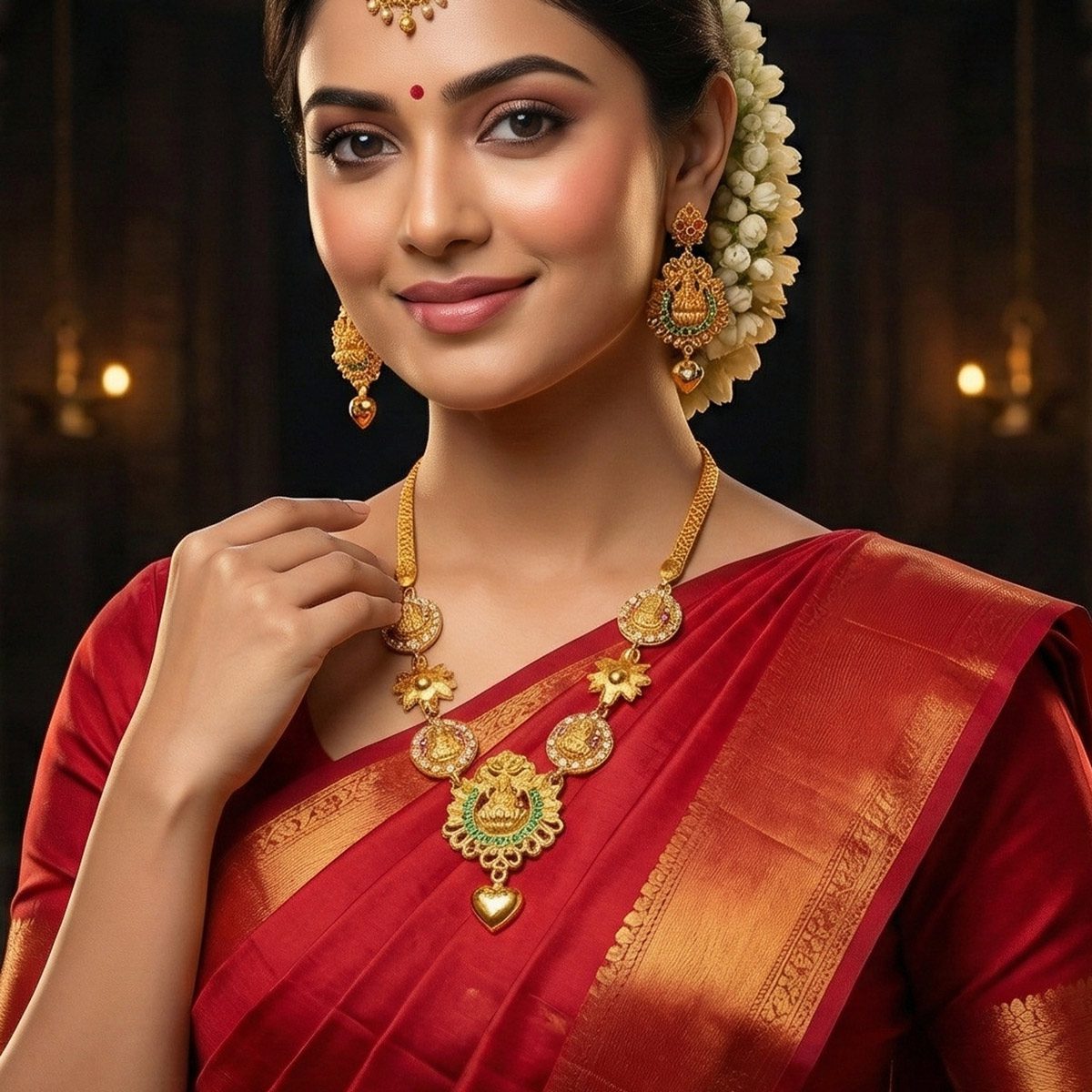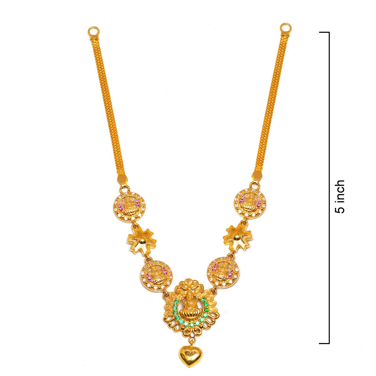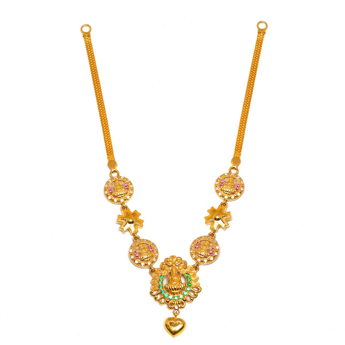 Featuring intricate Goddess Lakshmi motifs surrounded by sparkling white, pink, and green stones, this piece blends classic temple jewellery style with modern craftsmanship. The lightweight flat chain and delicate heart-shaped drop make it the perfect accessory for weddings, festivals, and auspicious occasions.”