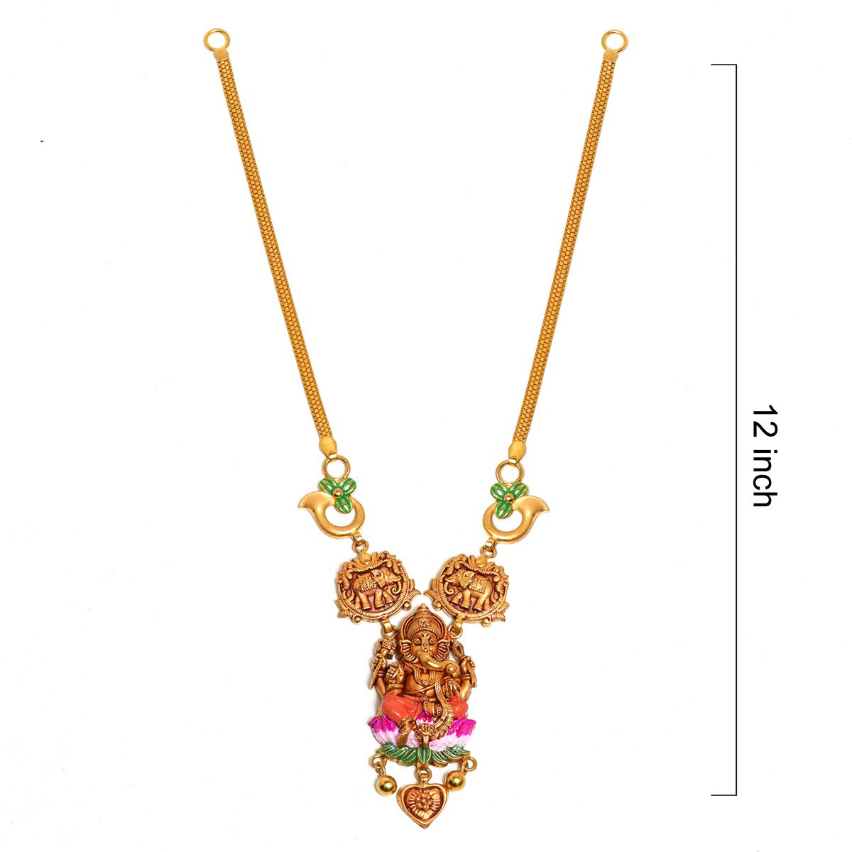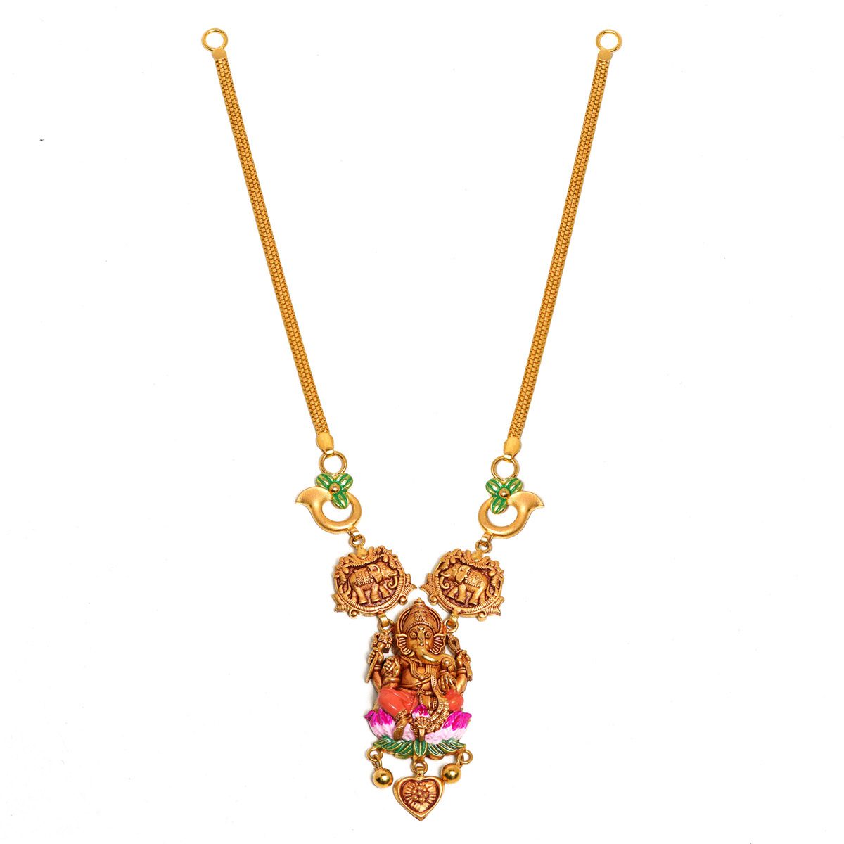 Embrace divine elegance with this 916 Gold Ganesha Necklace. Featuring a majestic Lord Ganesha seated on a blooming lotus, this antique-finish masterpiece is adorned with vibrant pink and green enamel work. The design is elevated by auspicious elephant motifs and stylized peacock connectors, reflecting true traditional artistry