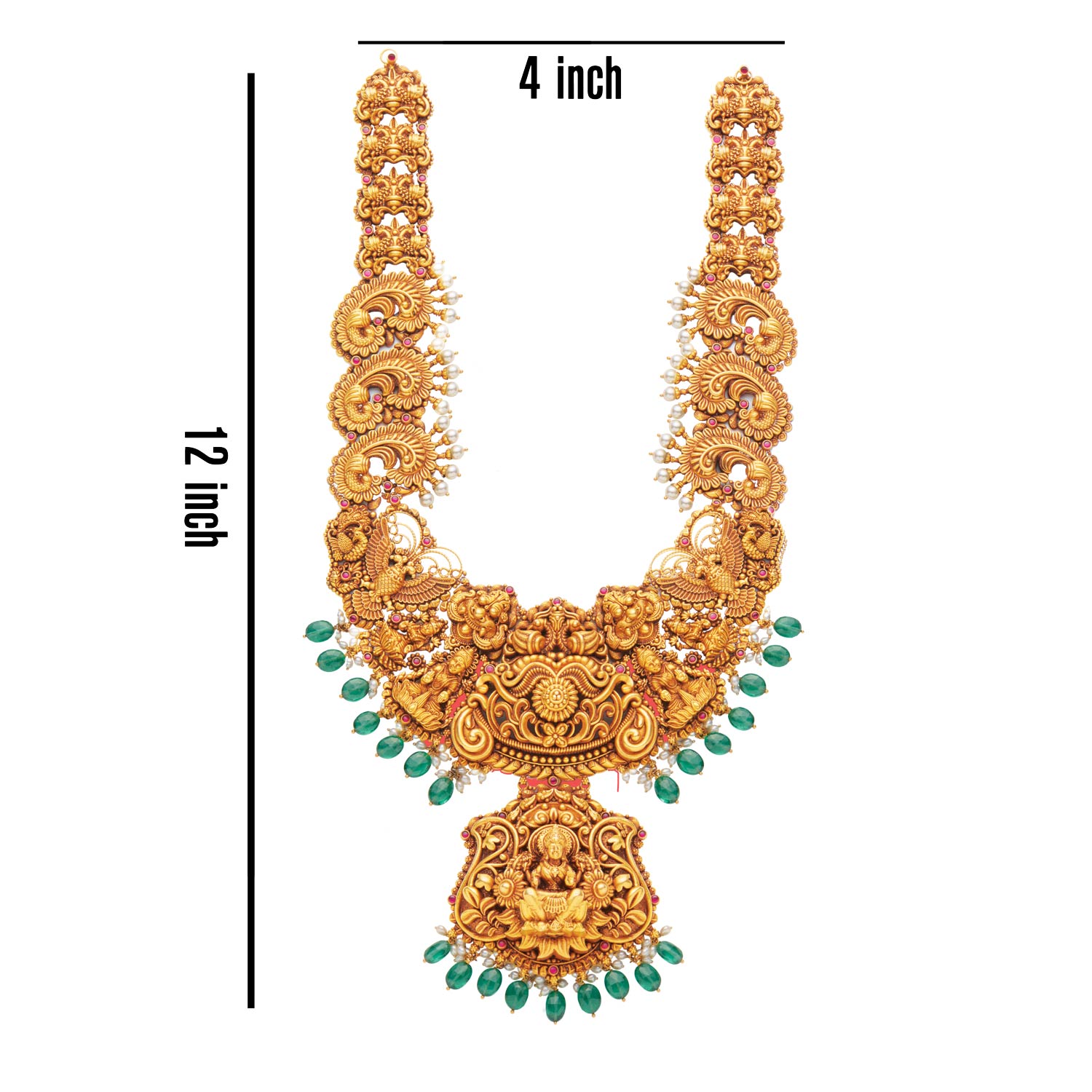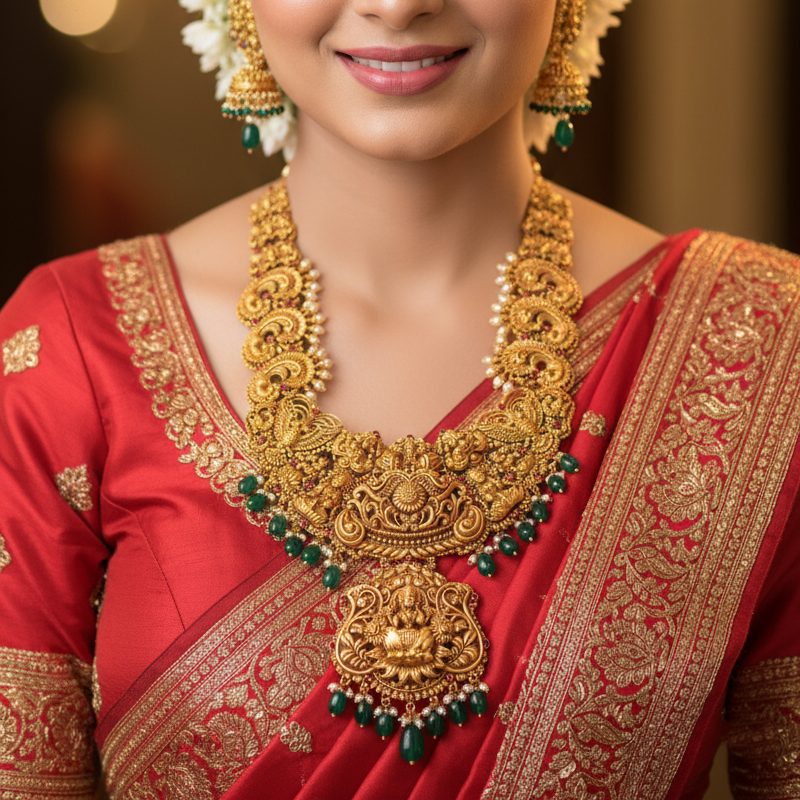 Exquisite 22K gold Lakshmi necklace with intricate filigree work, emerald gemstones, and ornate temple design. Premium spiritual & bridal jewelry with divine symbolism