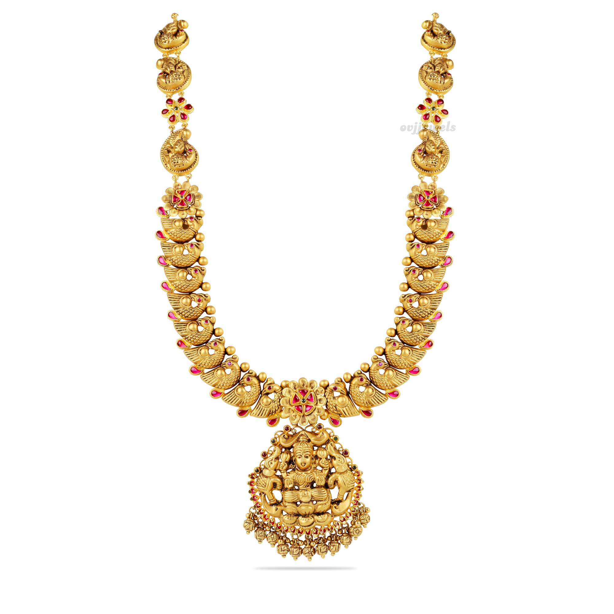 This 22k gold long Traditional Lakshmi long Necklace is studded with ruby emerald stones.