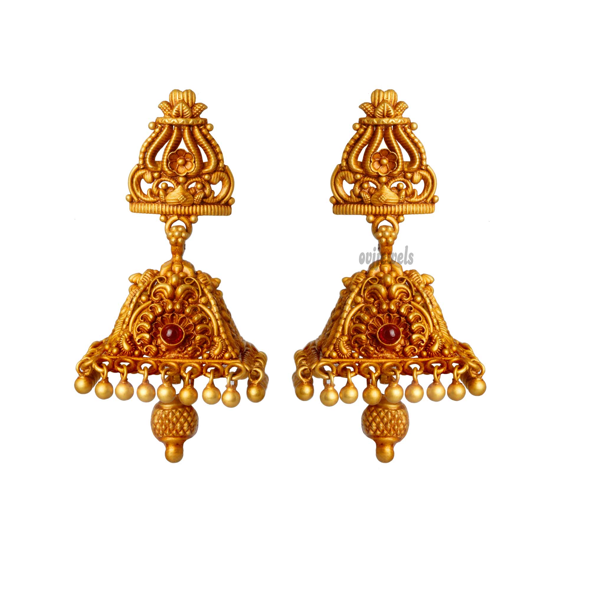 An awe-inspiring hand-crafted 22k gold jhumkka with kemp stones.