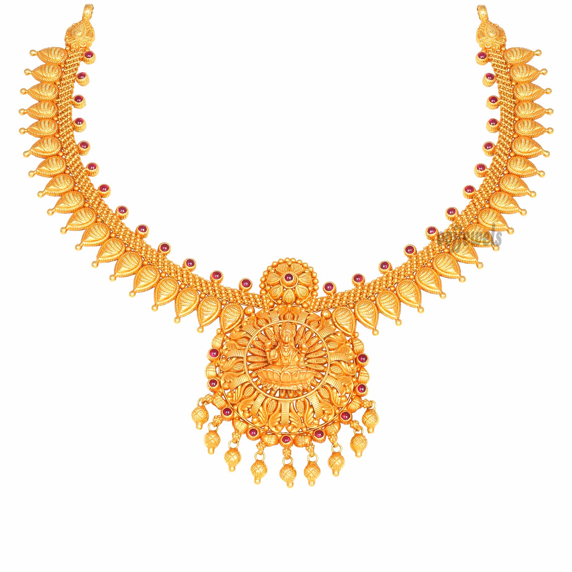 Designed to perfection, this short necklace sets off with a patterned design with kemp stones and converges in a grand central lakshmi supplemented with hanging beads.