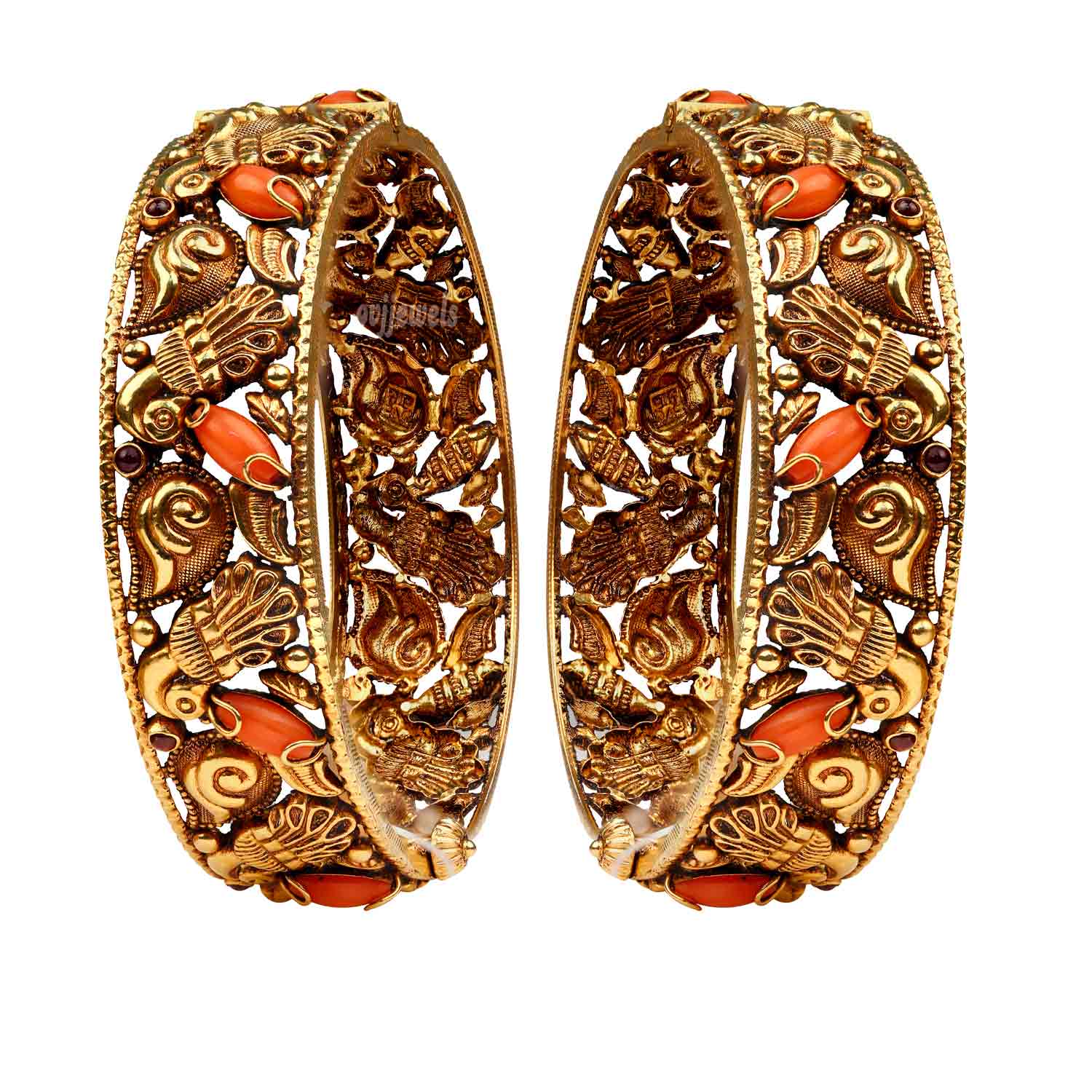 A stunning Pair of Bangles in coral topped by a pretty clasp. Wear this mesmerizing pair of 22kt gold bangles studded with coral stones and watch everyone go speechless with admiration.