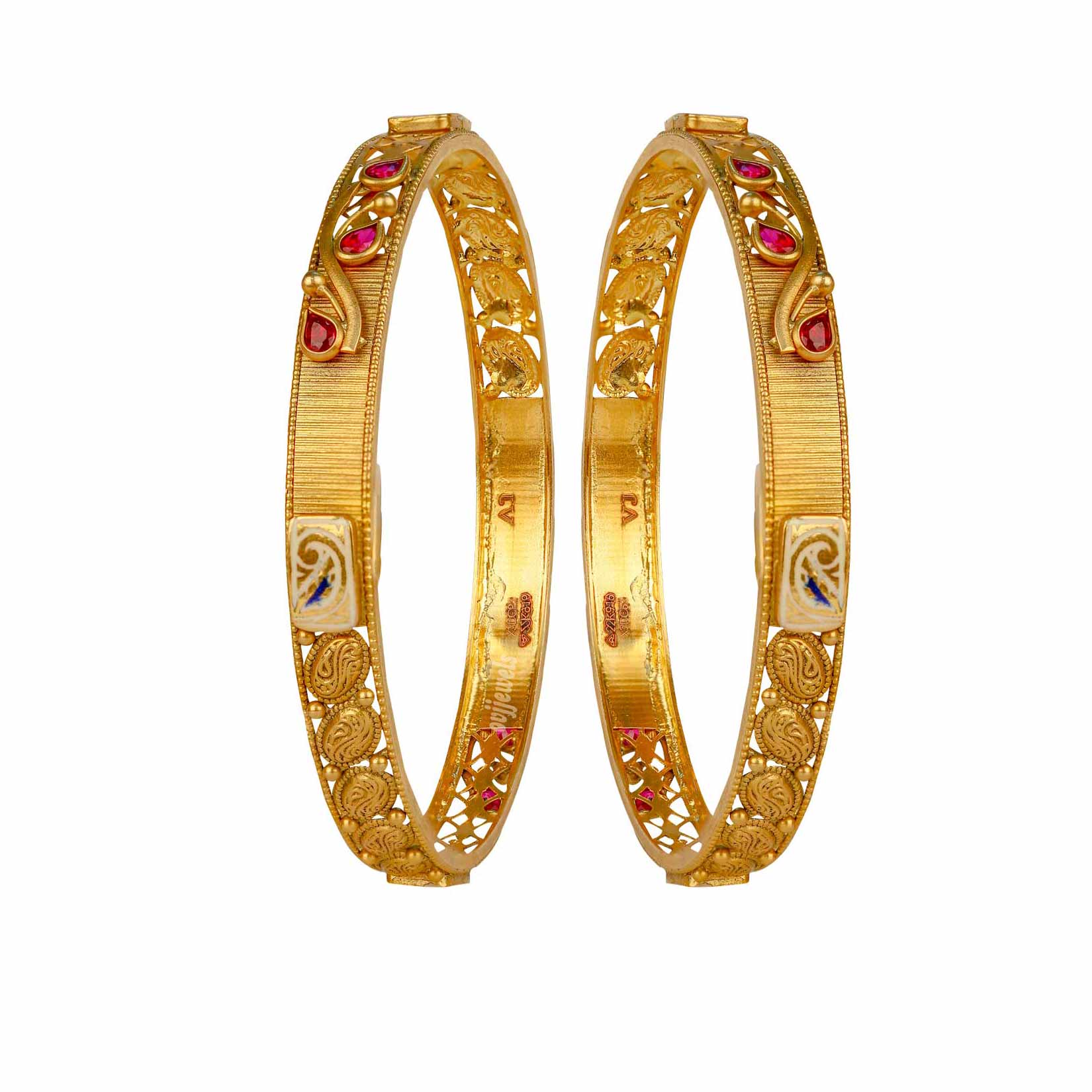 The bangles feature a unique wavy, oval-shaped design and are studded with four sets of Ruby Stones, radiating charm and elegance. .