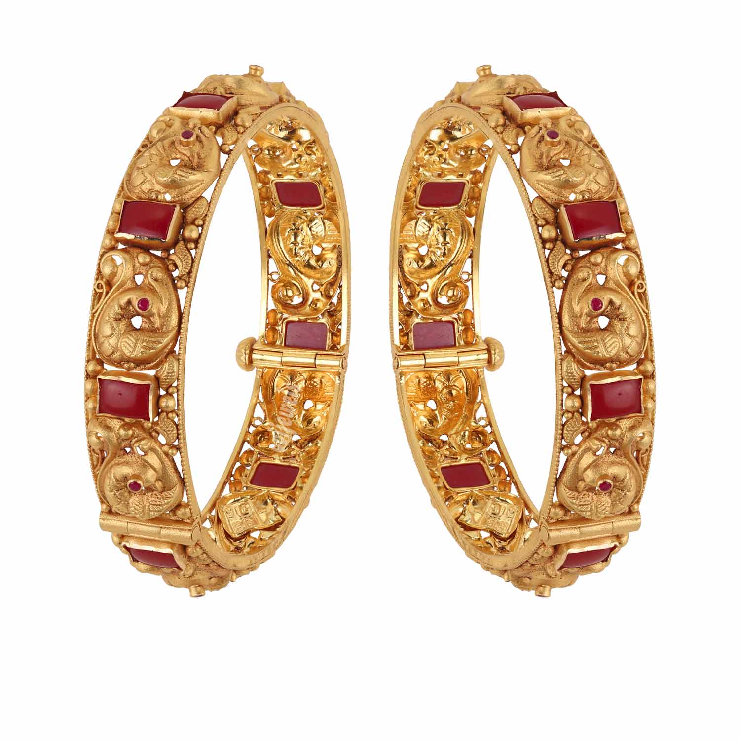 Alluringly designed, it can’t get any more traditional than this. this 22kt bangle is designed with delightful peacocks featuring all the way around and is studded with red kemp stones…