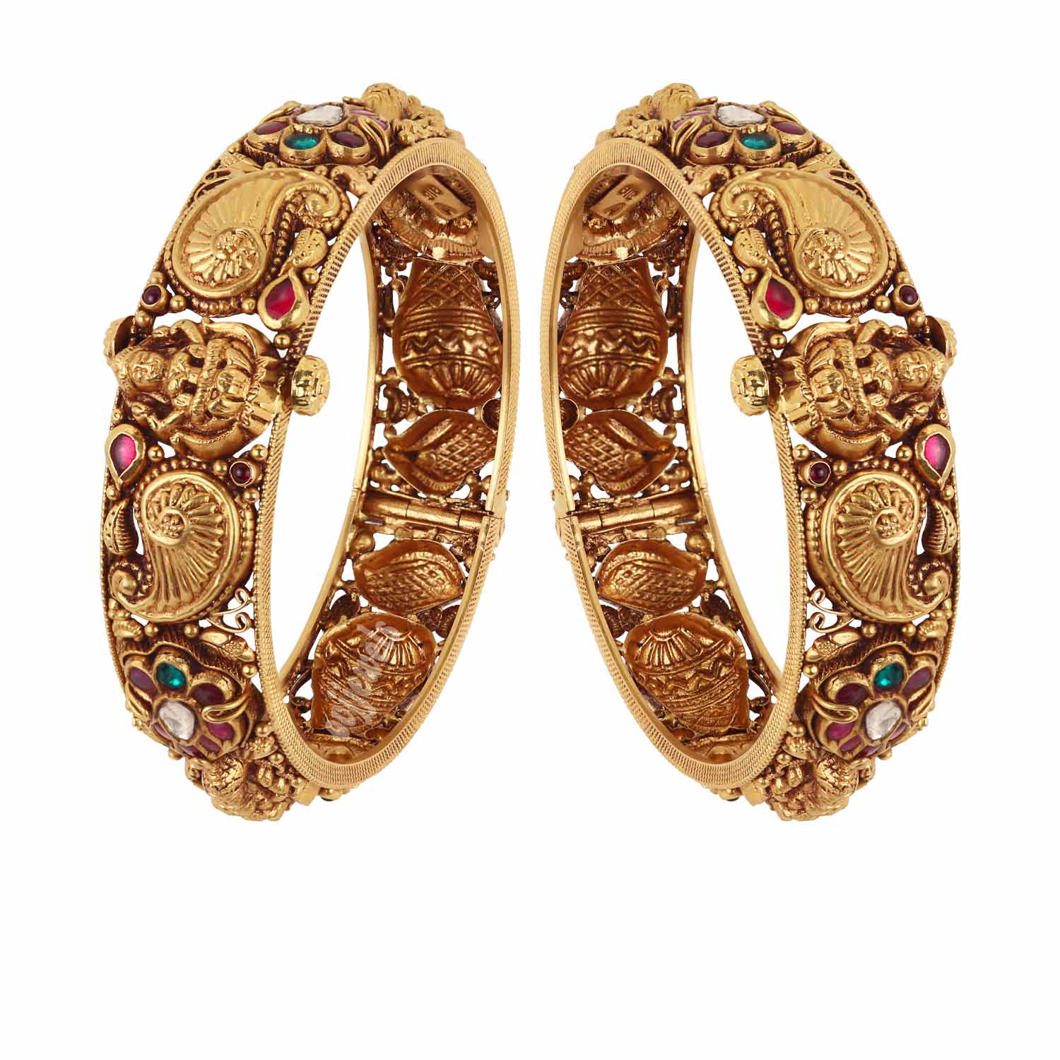 Beautiful Ruby ,emerald and kemp Stone come together in gold to create this exclusive bangle that is fit for royalty. This seamlessly handcrafted bangle comes with a screw and can be opened to gently fit your hand.
